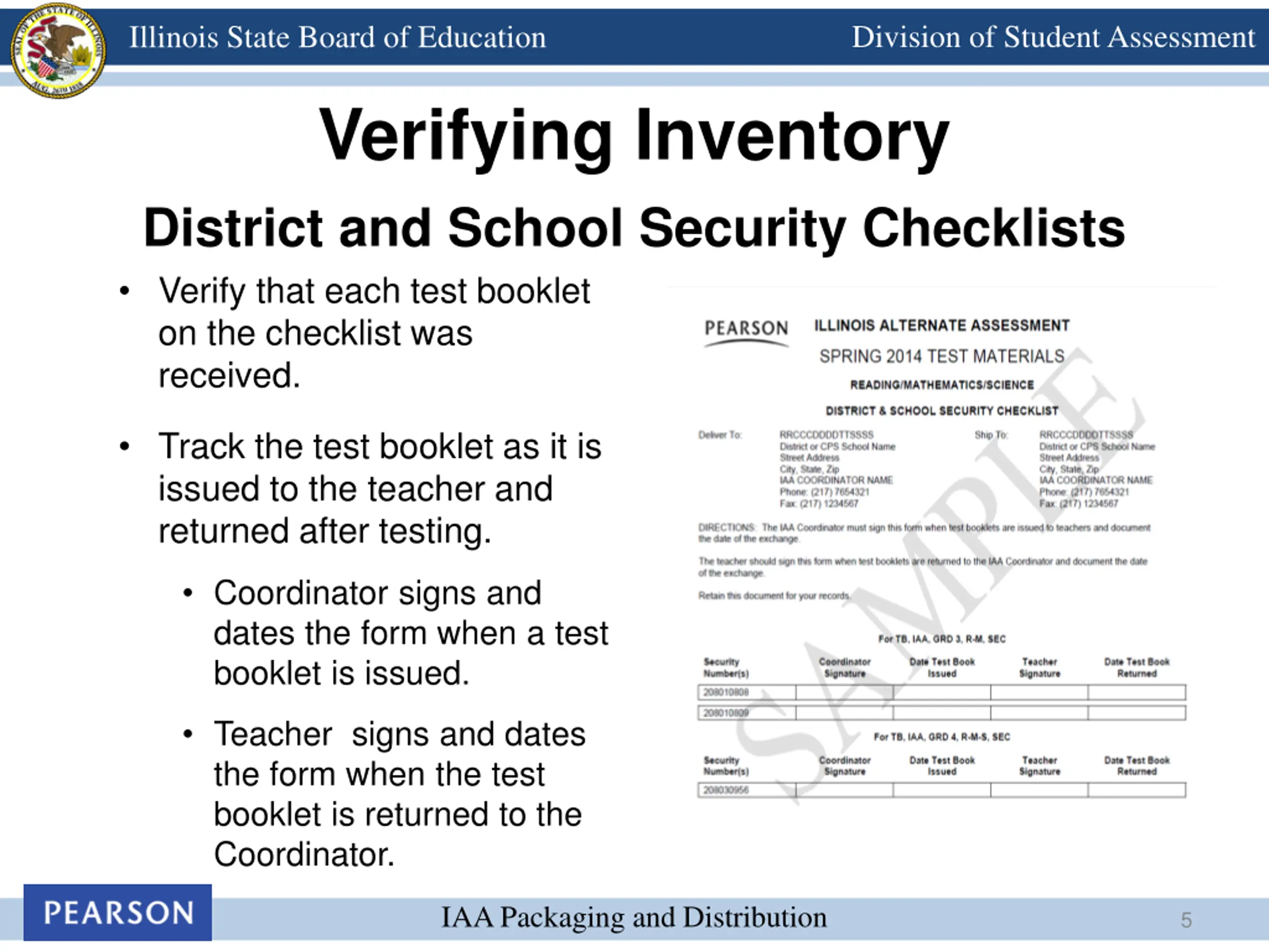 Division of Student Assessment Illinois State Board of Education Verifying Inventory Official Tracking Document This form is found in the IAA Implementation Manual SAMPL ONLY use this form if you have test booklets that are missing and will not be returned to Pearson This form needs to be faxed to Pearson. It is not to be packaged with the return shipment. IAA Packaging and Distribution 8