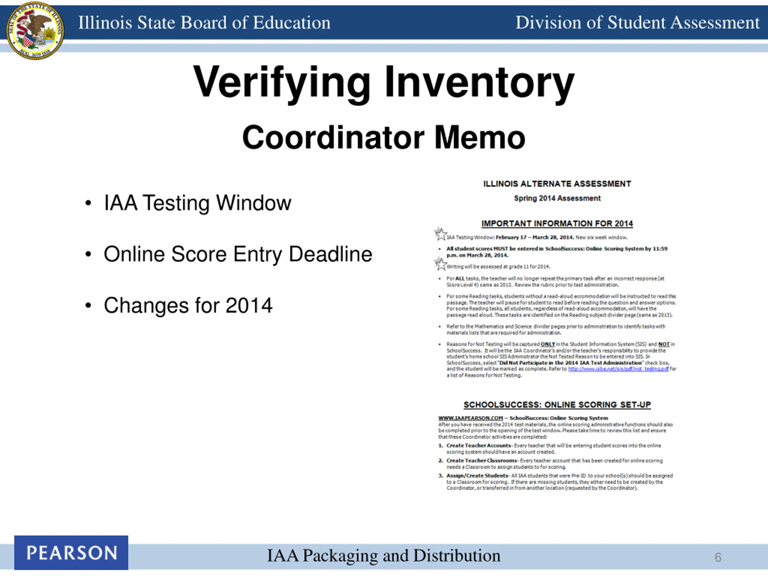 Division of Student Assessment Illinois State Board of Education Verifying Inventory Coordinator Memo IAA Testing Window Online Score Entry Deadline Changes for 2014 IAA Packaging and Distribution 6