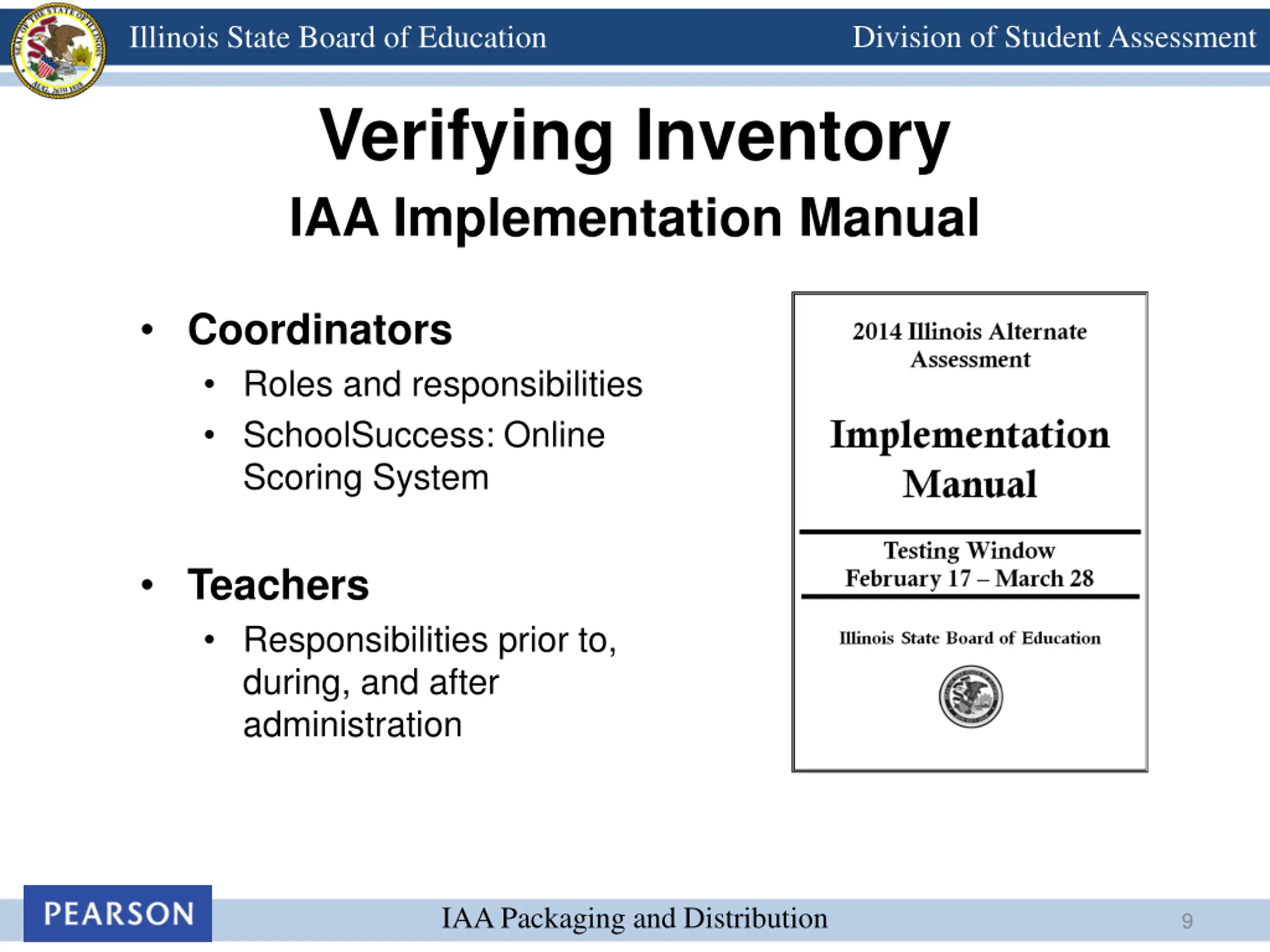 Division of Student Assessment Illinois State Board of Education Verifying Inventory IAA Implementation Manual Coordinators Roles and responsibilities SchoolSuccess: Online Scoring System Teachers Responsibilities prior to, during, and after administration IAA Packaging and Distribution 9