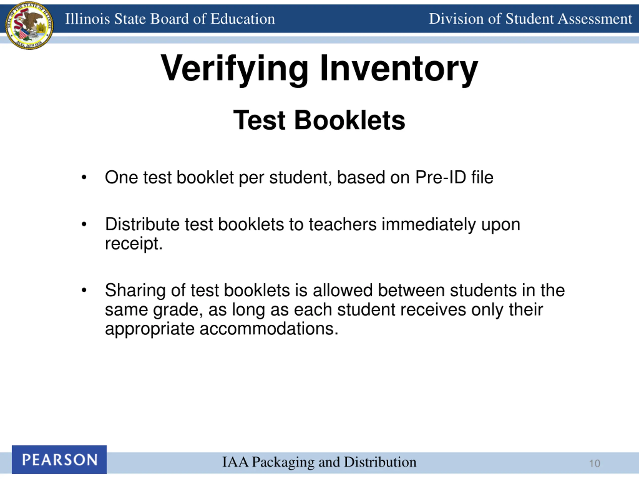 Division of Student Assessment Illinois State Board of Education Verifying Inventory Test Booklets One test booklet per student, based on Pre-ID file Distribute test booklets to teachers immediately upon receipt. Sharing of test booklets is allowed between students in the same grade, as long as each student receives only their appropriate accommodations. IAA Packaging and Distribution 10