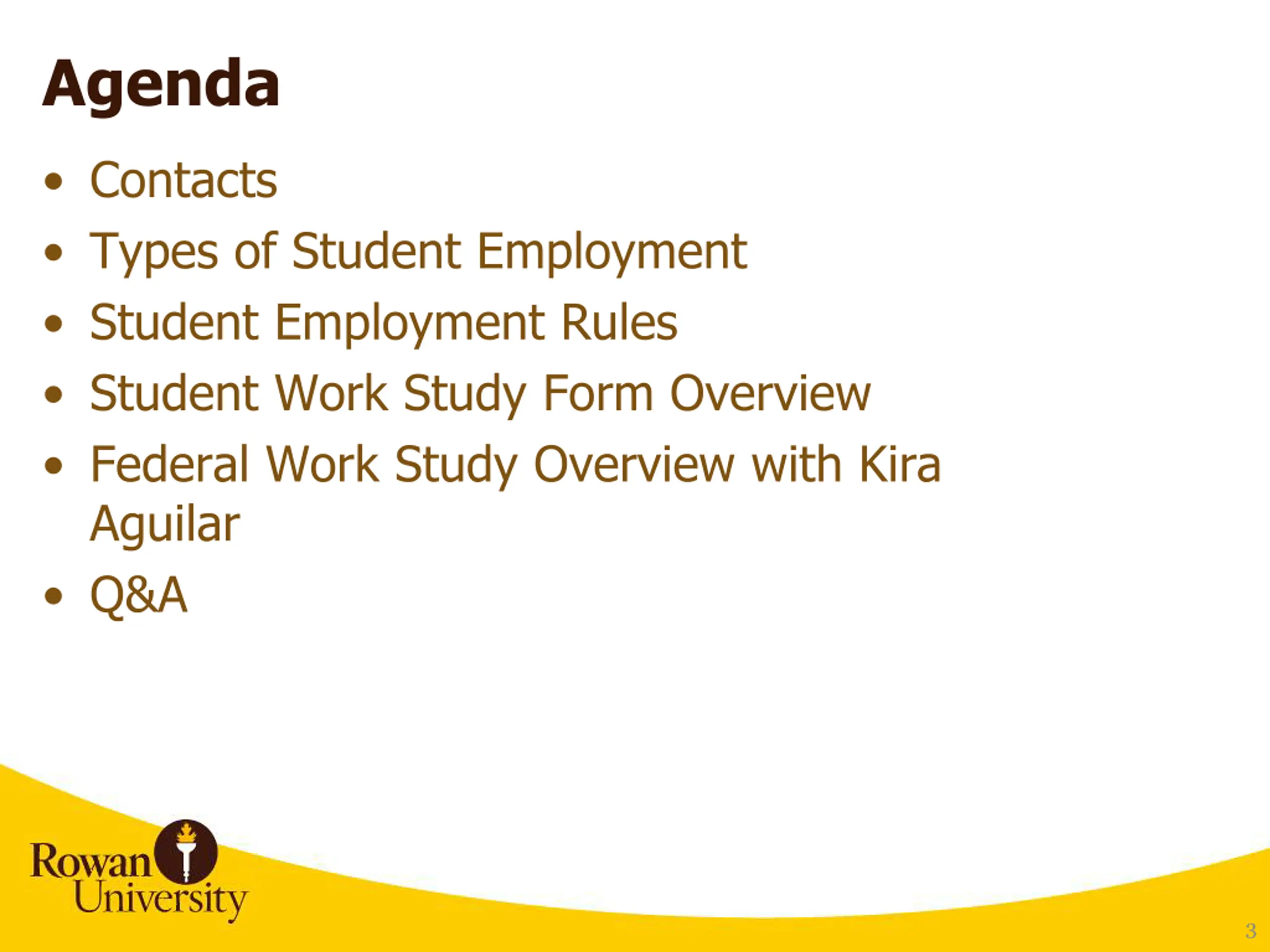 Agenda Contacts Types of Student Employment Student Employment Rules Student Work Study Form Overview Federal Work Study Overview with Kira Aguilar Q&A 3