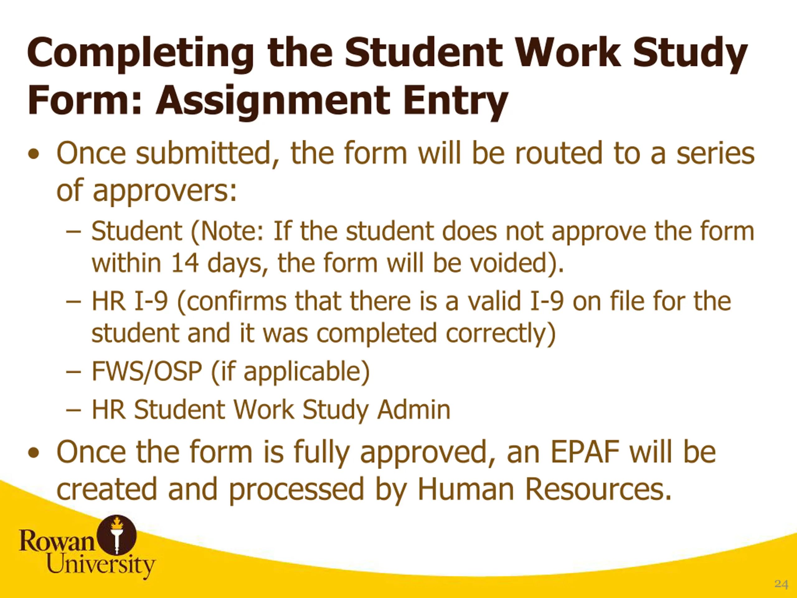 Completing the Student Work Study Form: Assignment Entry Once submitted, the form will be routed to a series of approvers: Student (Note: If the student does not approve the form within 14 days, the form will be voided). HR I-9 (confirms that there is a valid I-9 on file for the student and it was completed correctly) FWS/OSP (if applicable) HR Student Work Study Admin Once the form is fully approved, an EPAF will be created and processed by Human Resources. 24