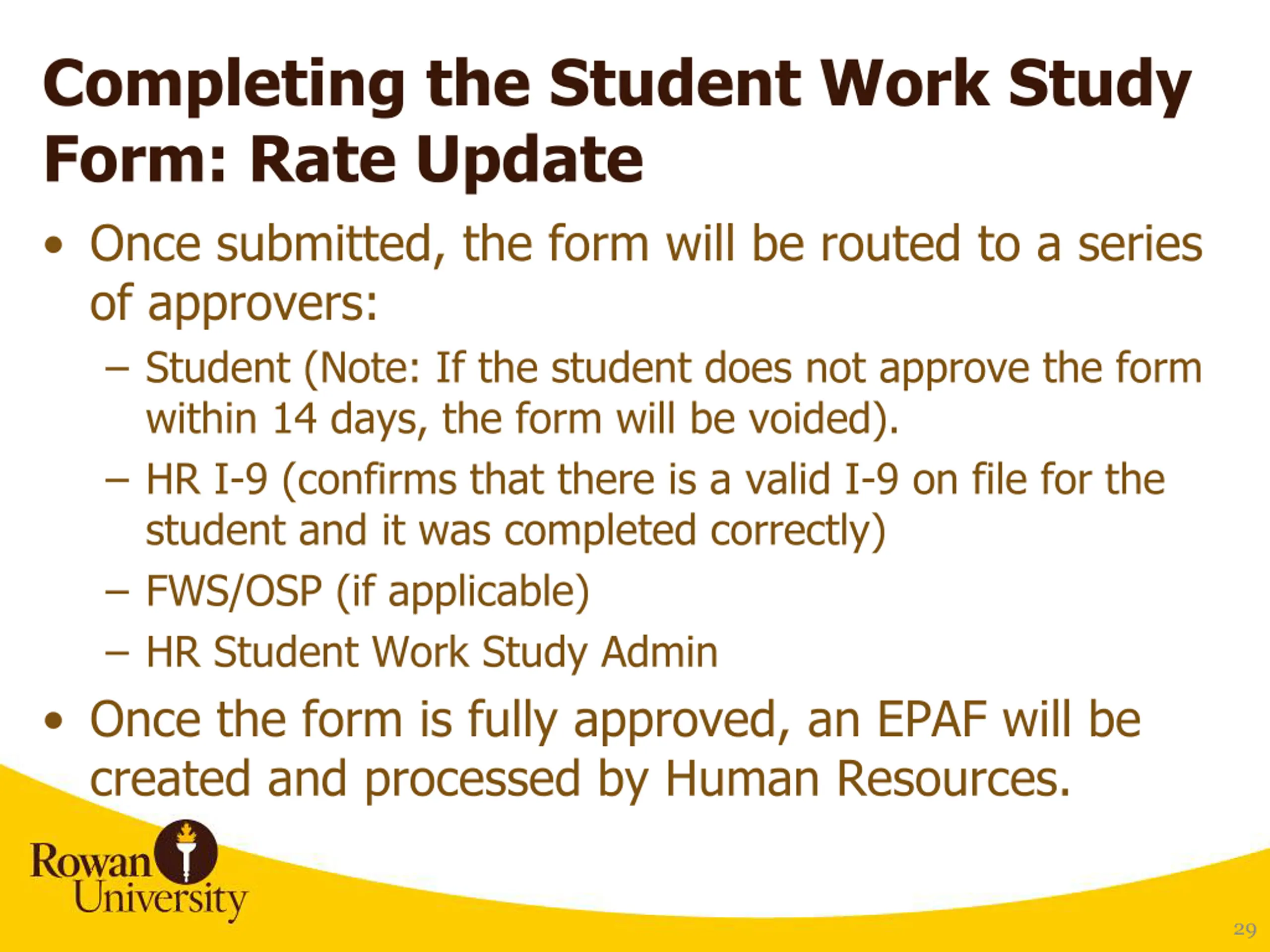 Completing the Student Work Study Form: Rate Update Once submitted, the form will be routed to a series of approvers: Student (Note: If the student does not approve the form within 14 days, the form will be voided). HR I-9 (confirms that there is a valid I-9 on file for the student and it was completed correctly) FWS/OSP (if applicable) HR Student Work Study Admin Once the form is fully approved, an EPAF will be created and processed by Human Resources. 29