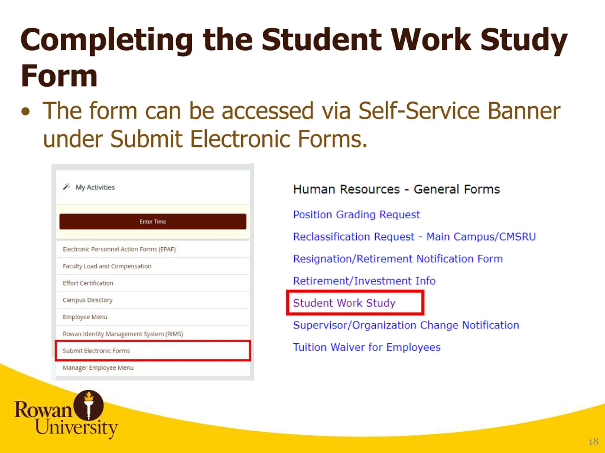 Completing the Student Work Study Form The form can be accessed via Self-Service Banner under Submit Electronic Forms. 18
