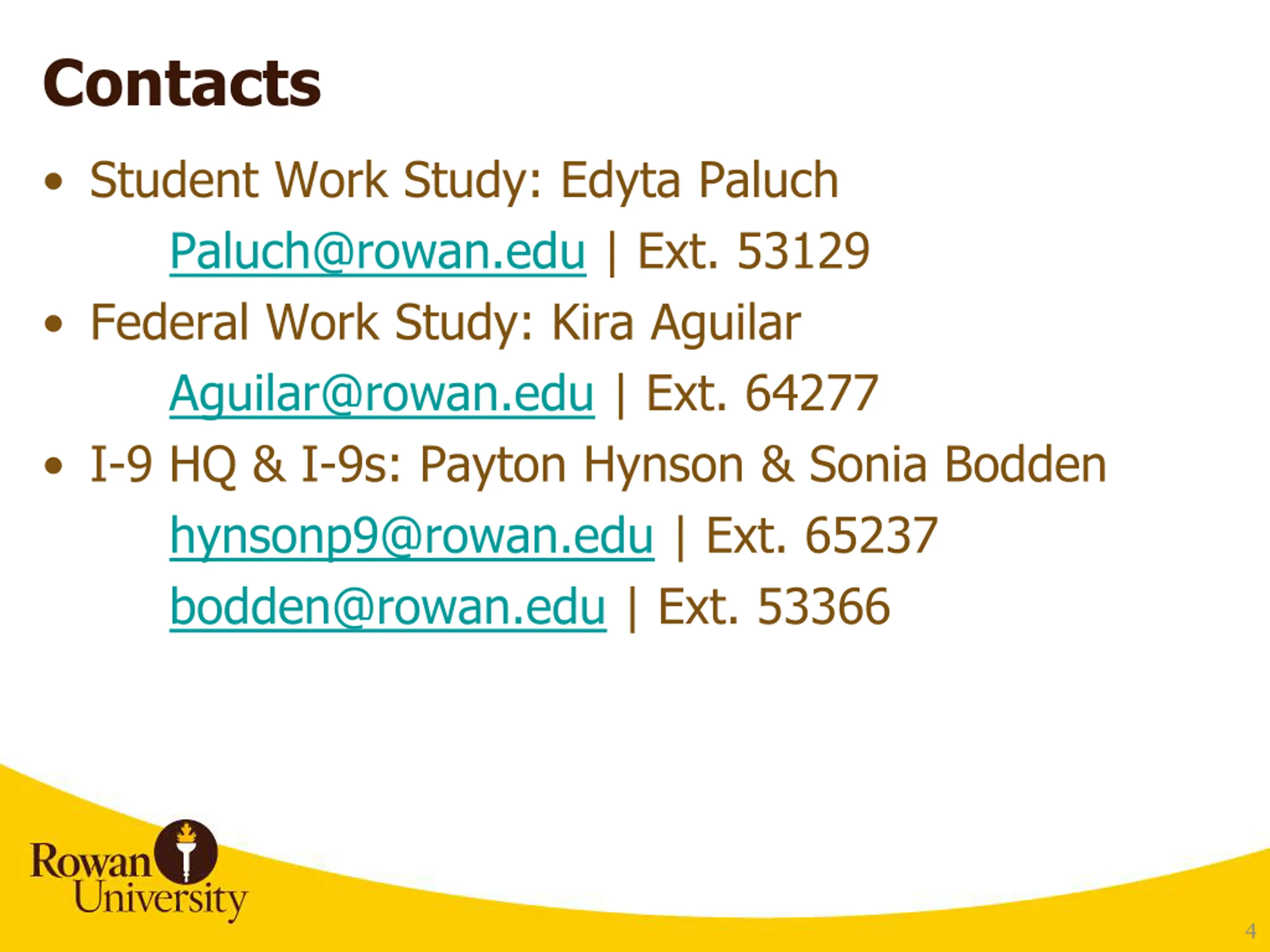 Contacts Student Work Study: Edyta Paluch Paluch@rowan.edu | Ext. 53129 Federal Work Study: Kira Aguilar Aguilar@rowan.edu | Ext. 64277 I-9 HQ & I-9s: Payton Hynson & Sonia Bodden hynsonp9@rowan.edu | Ext. 65237 bodden@rowan.edu | Ext. 53366 4