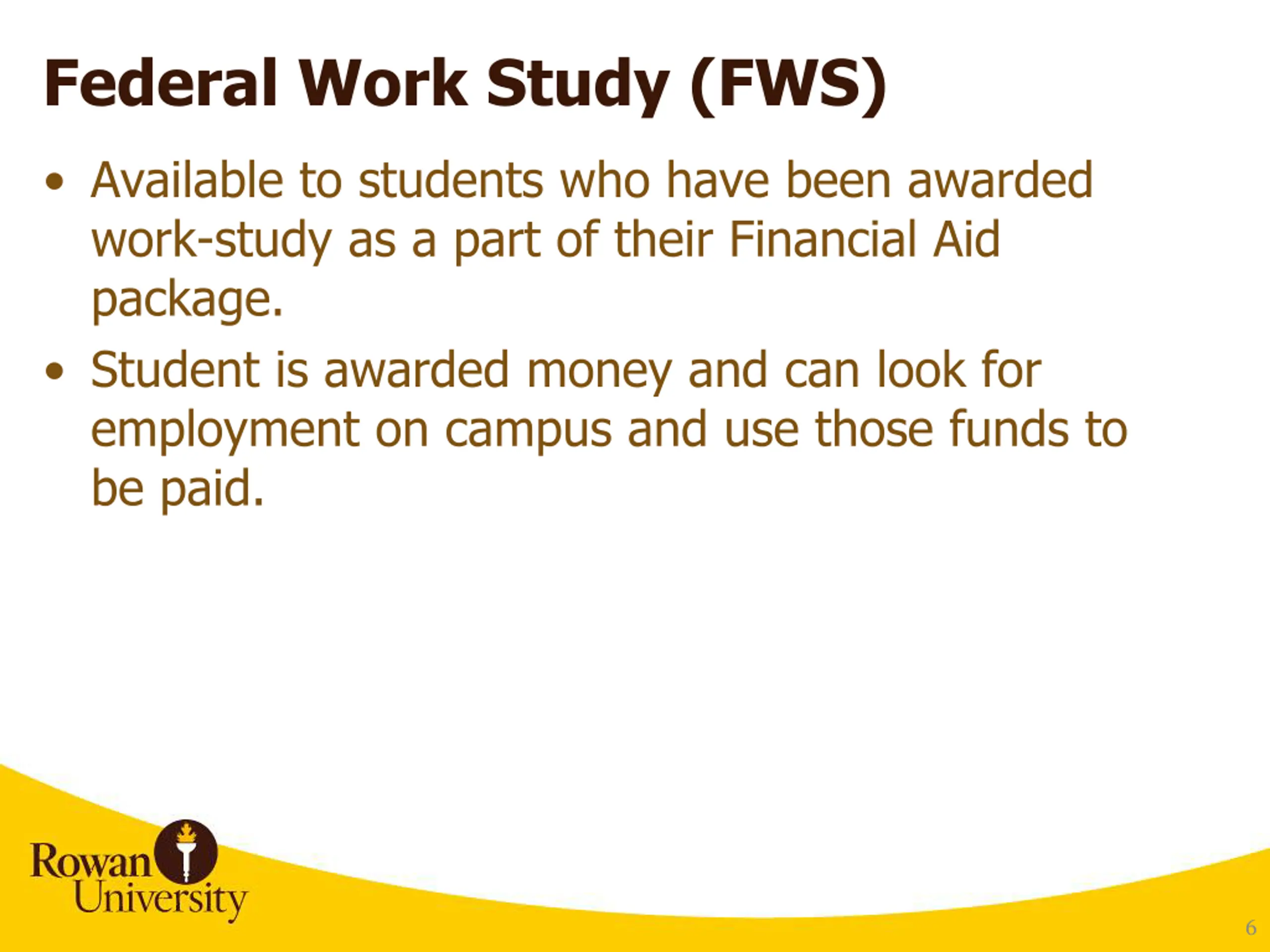 Federal Work Study (FWS) Available to students who have been awarded work-study as a part of their Financial Aid package. Student is awarded money and can look for employment on campus and use those funds to be paid. 6