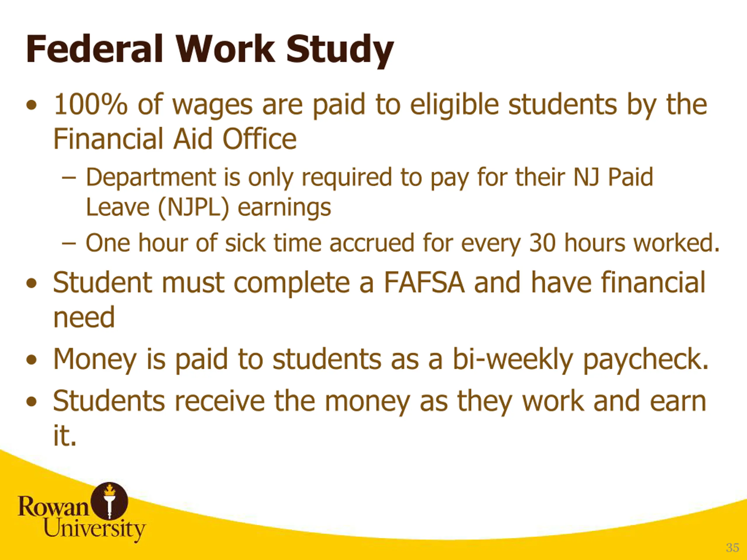 Federal Work Study 100% of wages are paid to eligible students by the Financial Aid Office Department is only required to pay for their NJ Paid Leave (NJPL) earnings One hour of sick time accrued for every 30 hours worked. Student must complete a FAFSA and have financial need Money is paid to students as a bi-weekly paycheck. Students receive the money as they work and earn it. 35