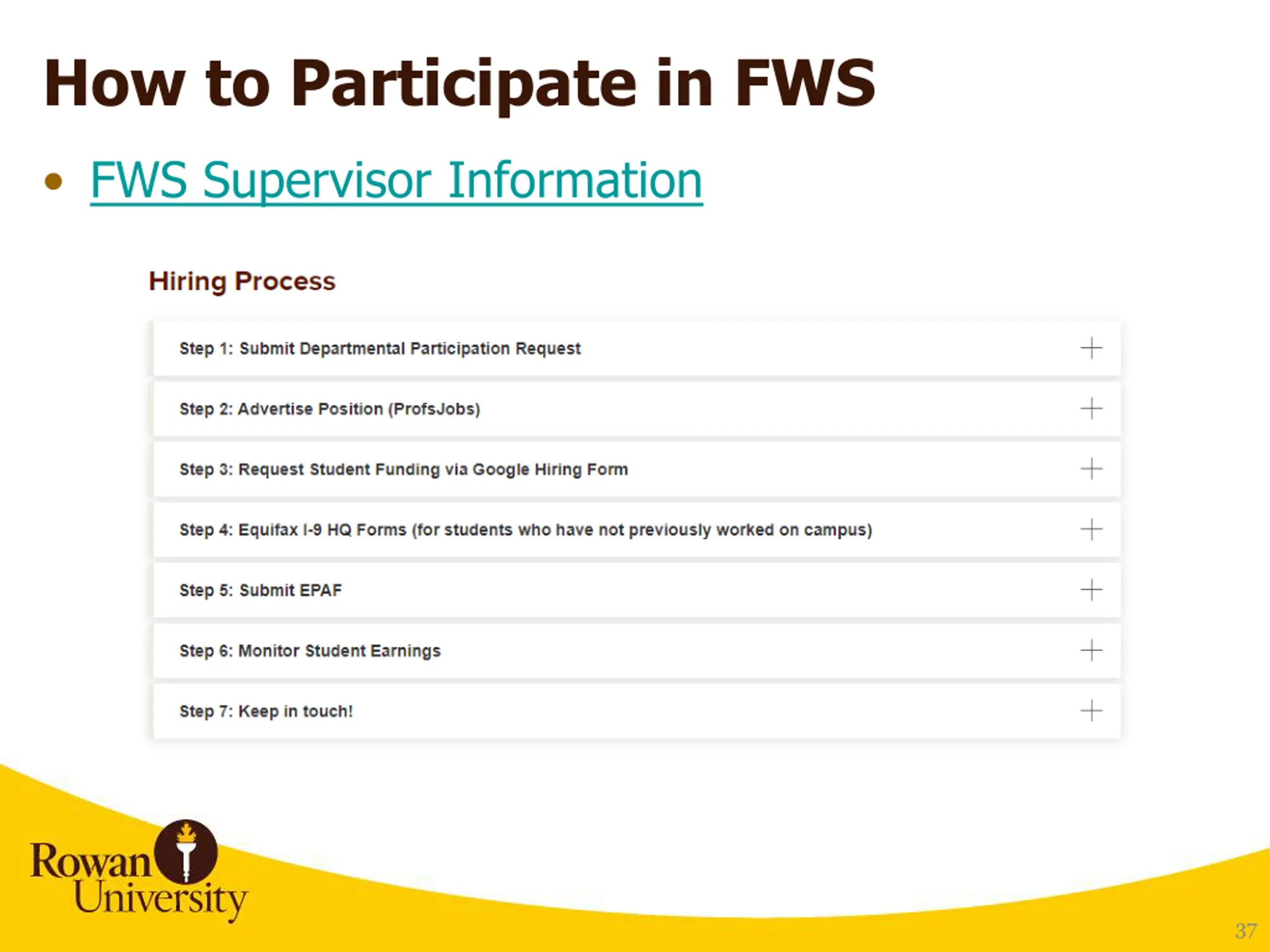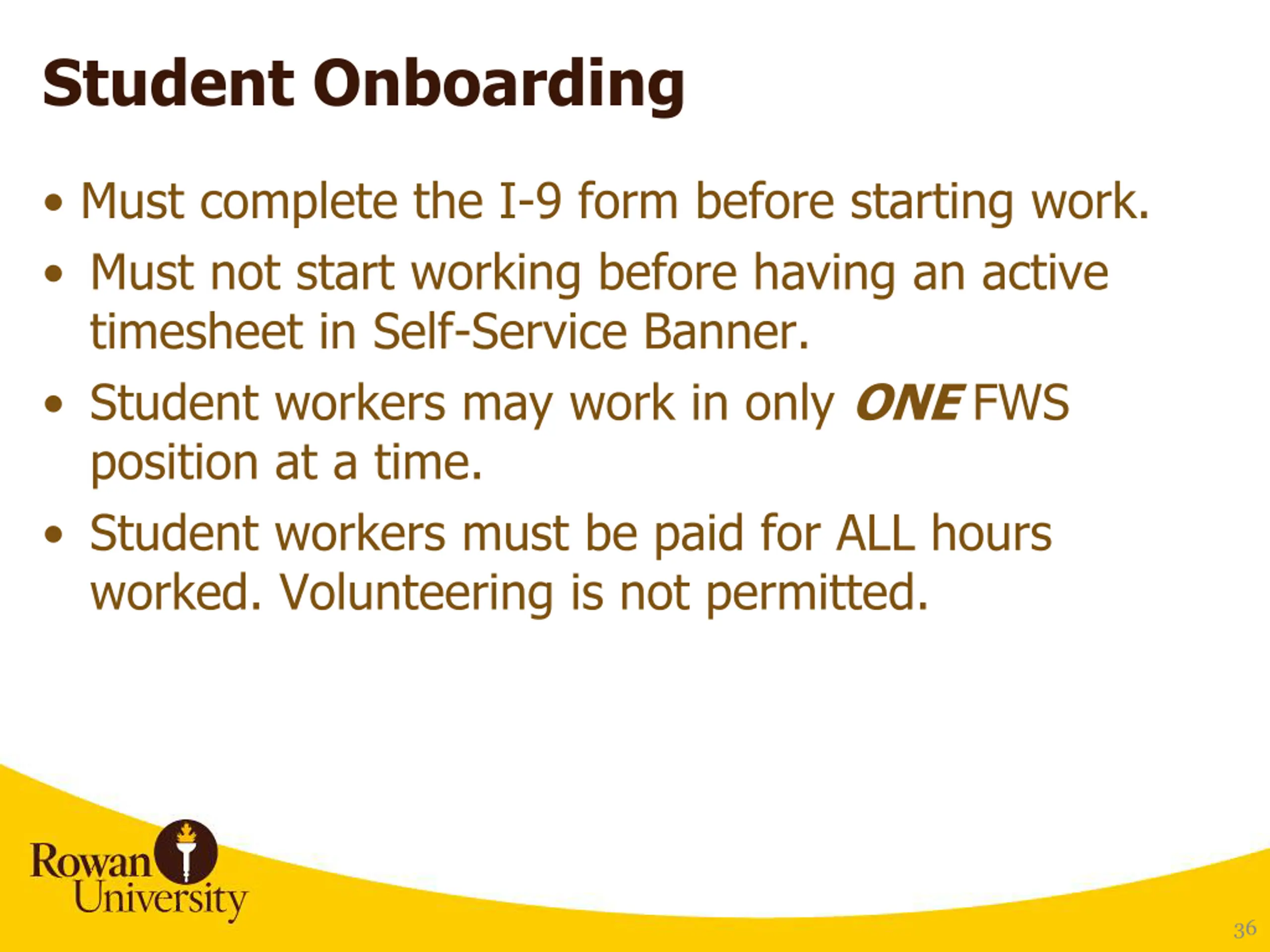 Student Onboarding Must complete the I-9 form before starting work. Must not start working before having an active timesheet in Self-Service Banner. Student workers may work in only ONE FWS position at a time. Student workers must be paid for ALL hours worked. Volunteering is not permitted. 36