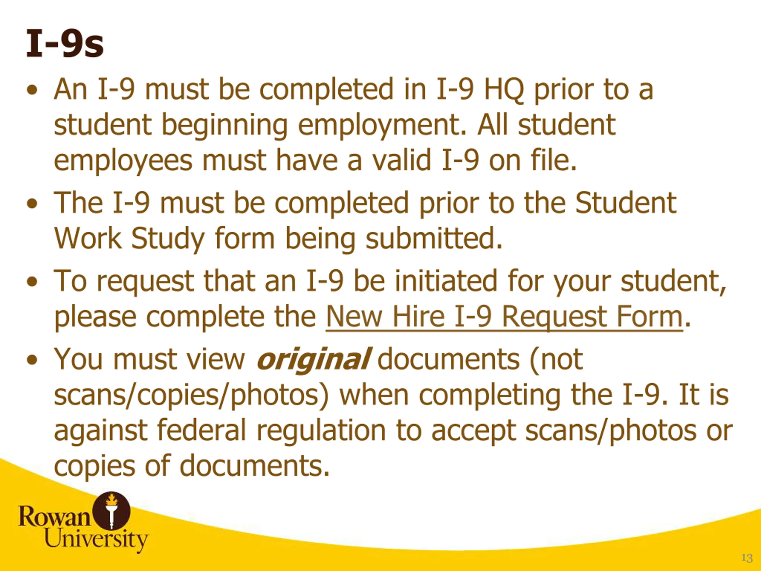 I-9s An I-9 must be completed in I-9 HQ prior to a student beginning employment. All student employees must have a valid I-9 on file. The I-9 must be completed prior to the Student Work Study form being submitted. To request that an I-9 be initiated for your student, please complete the New Hire I-9 Request Form. You must view original documents (not scans/copies/photos) when completing the I-9. It is against federal regulation to accept scans/photos or copies of documents. 13