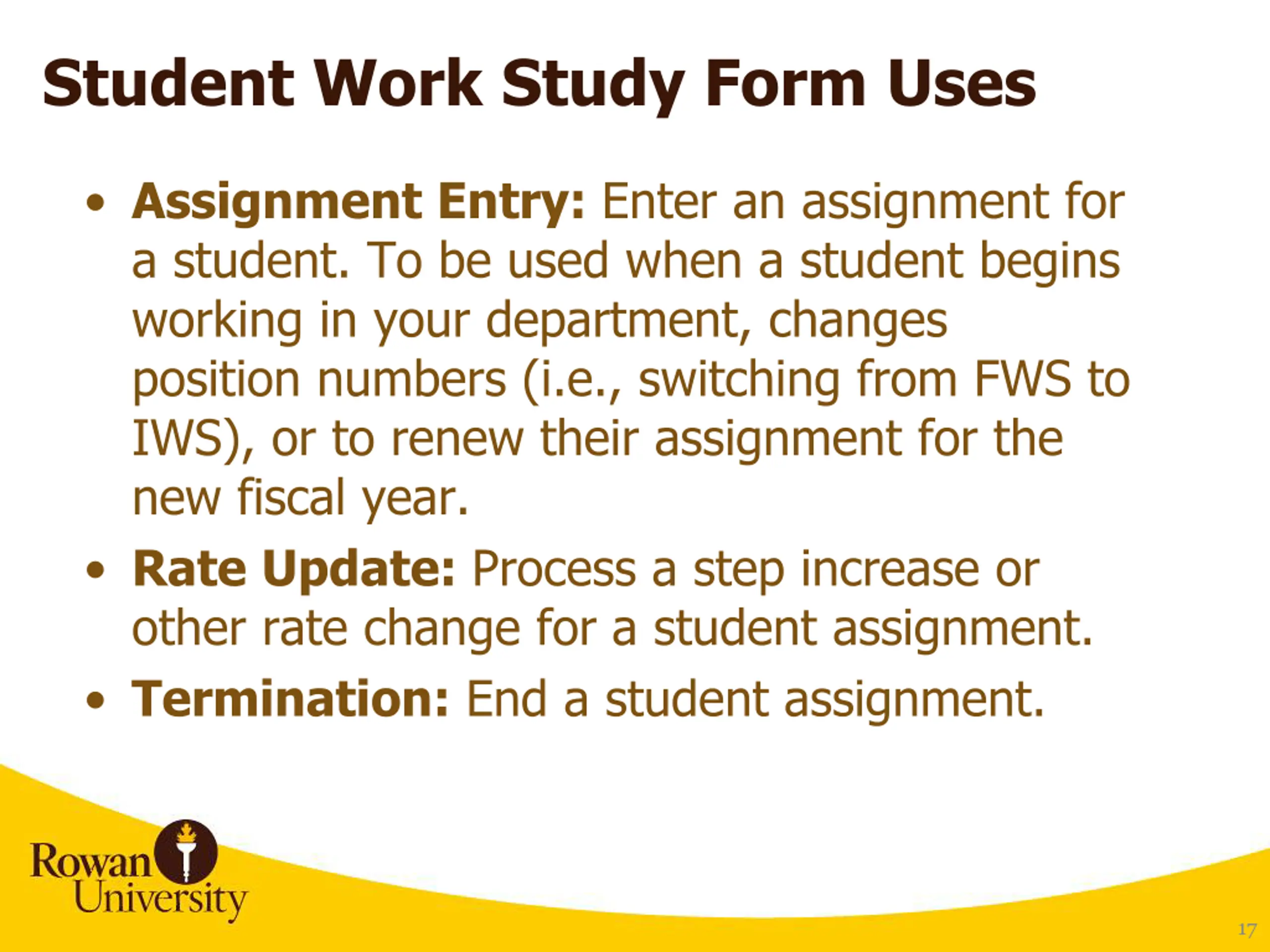 Student Work Study Form Uses Assignment Entry: Enter an assignment for a student. To be used when a student begins working in your department, changes position numbers (i.e., switching from FWS to IWS), or to renew their assignment for the new fiscal year. Rate Update: Process a step increase or other rate change for a student assignment. Termination: End a student assignment. 17
