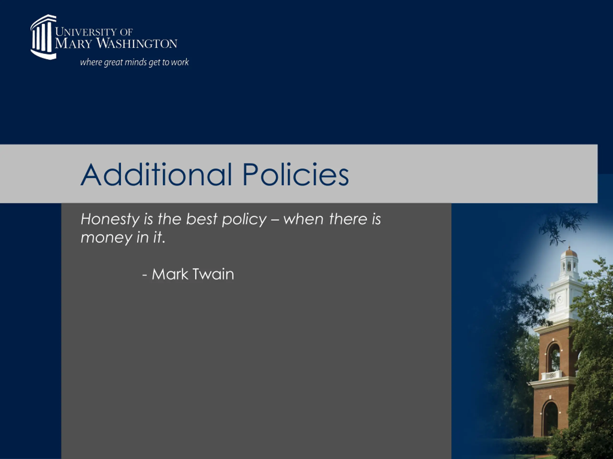 Additional Policies Honesty is the best policy when there is money in it. - Mark Twain