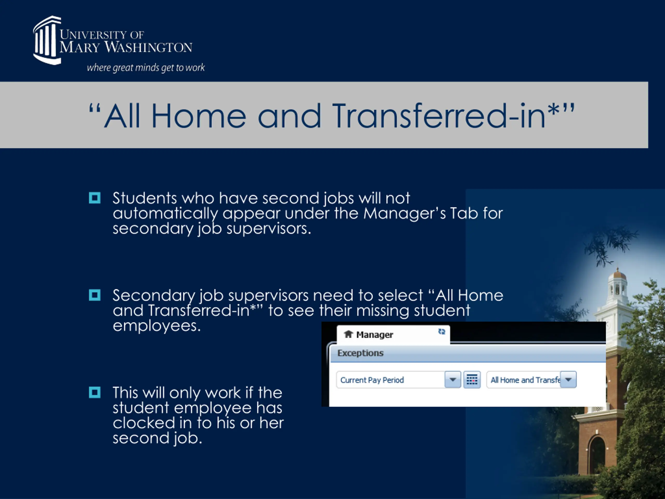 All Home and Transferred-in* Students who have second jobs will not automatically appear under the Manager s Tab for secondary job supervisors. Secondary job supervisors need to select All Home and Transferred-in* to see their missing student employees. This will only work if the student employee has clocked in to his or her second job.