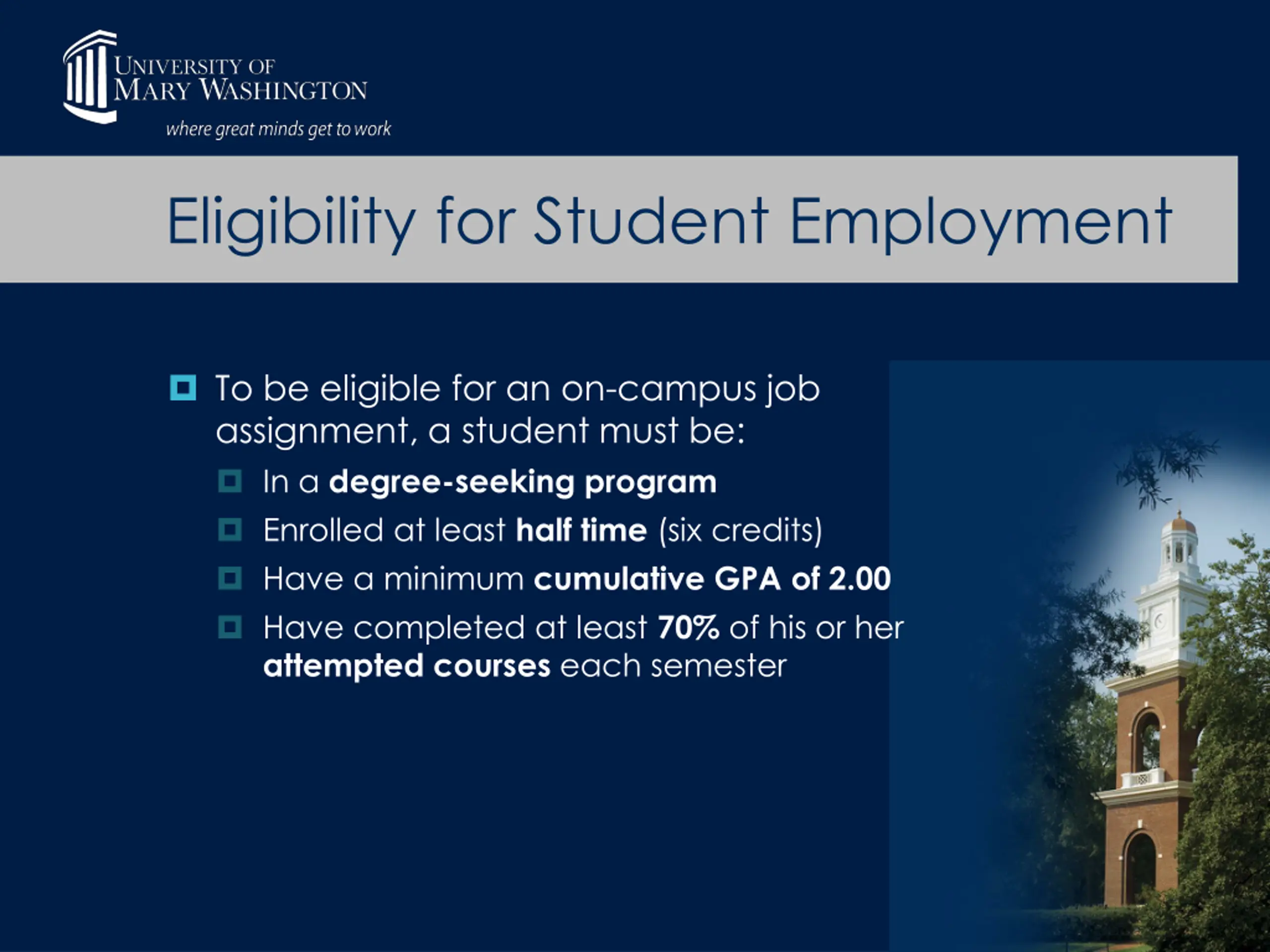 Eligibility for Student Employment To be eligible for an on-campus job assignment, a student must be: In a degree-seeking program Enrolled at least half time (six credits) Have a minimum cumulative GPA of 2.00 Have completed at least 70% of his or her attempted courses each semester