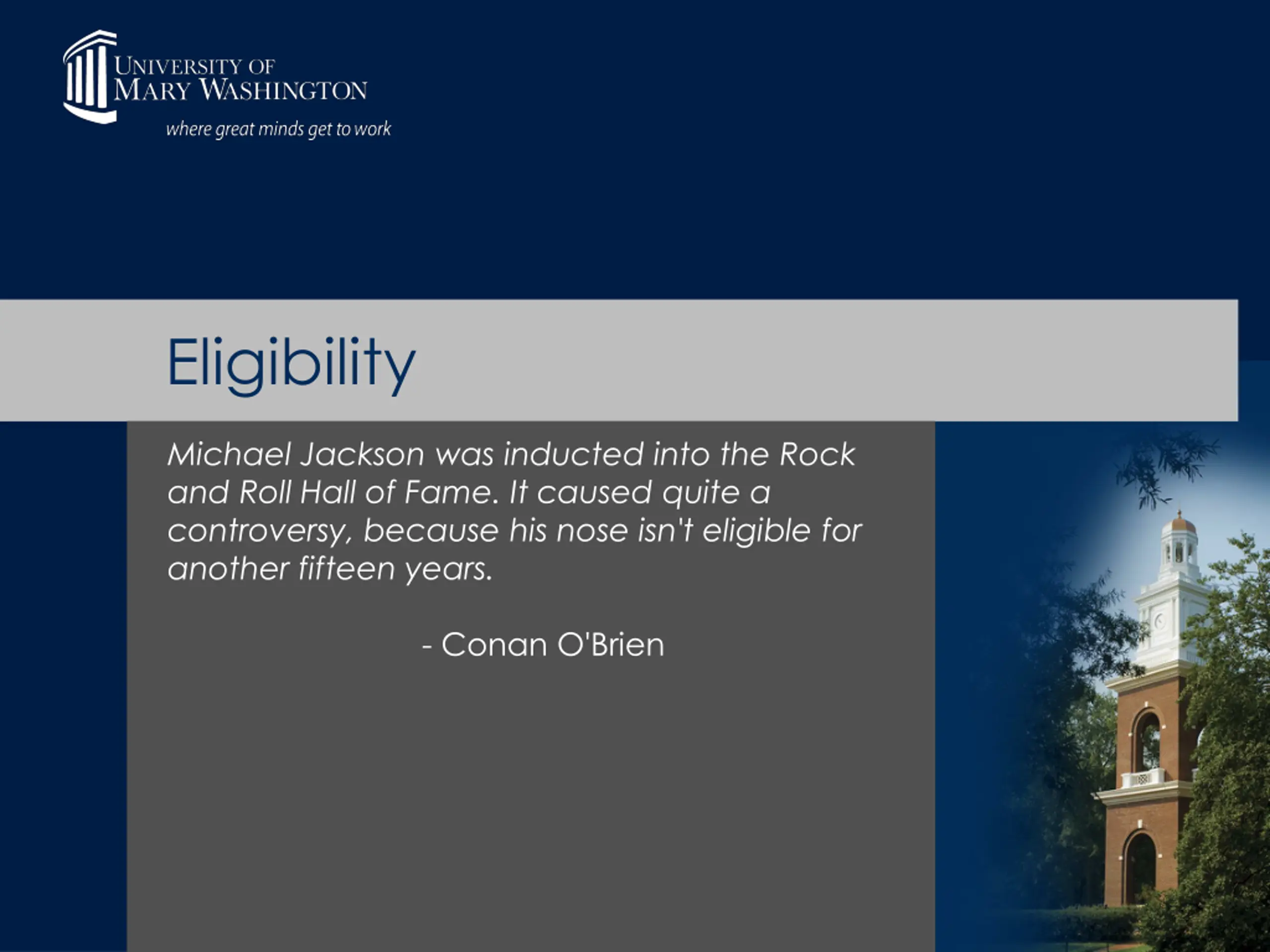 Eligibility Michael Jackson was inducted into the Rock and Roll Hall of Fame. It caused quite a controversy, because his nose isn't eligible for another fifteen years. - Conan O'Brien