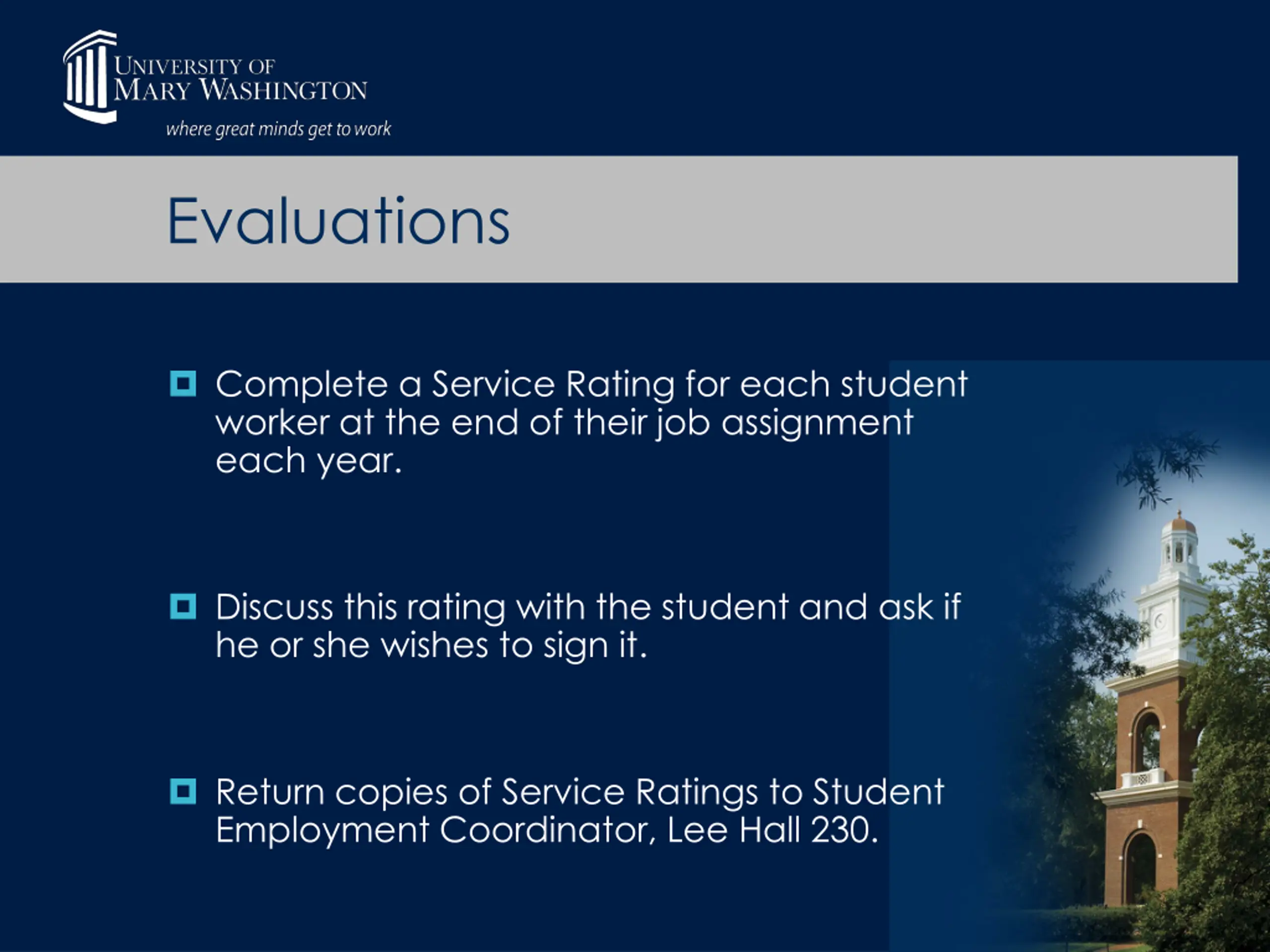 Evaluations Complete a Service Rating for each student worker at the end of their job assignment each year. Discuss this rating with the student and ask if he or she wishes to sign it. Return copies of Service Ratings to Student Employment Coordinator, Lee Hall 230.