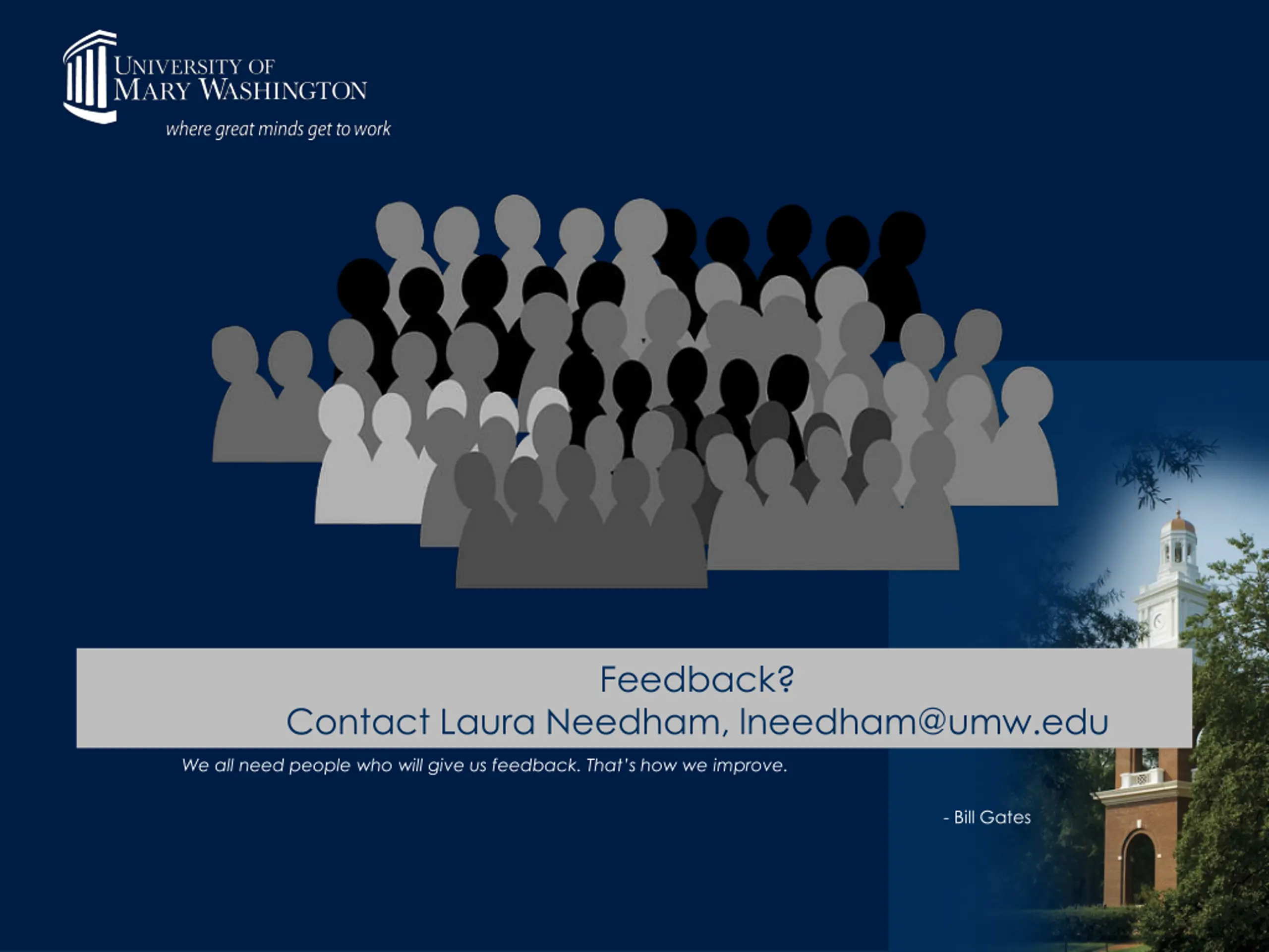 Feedback? Contact Laura Needham, lneedham@umw.edu We all need people who will give us feedback. That s how we improve. - Bill Gates