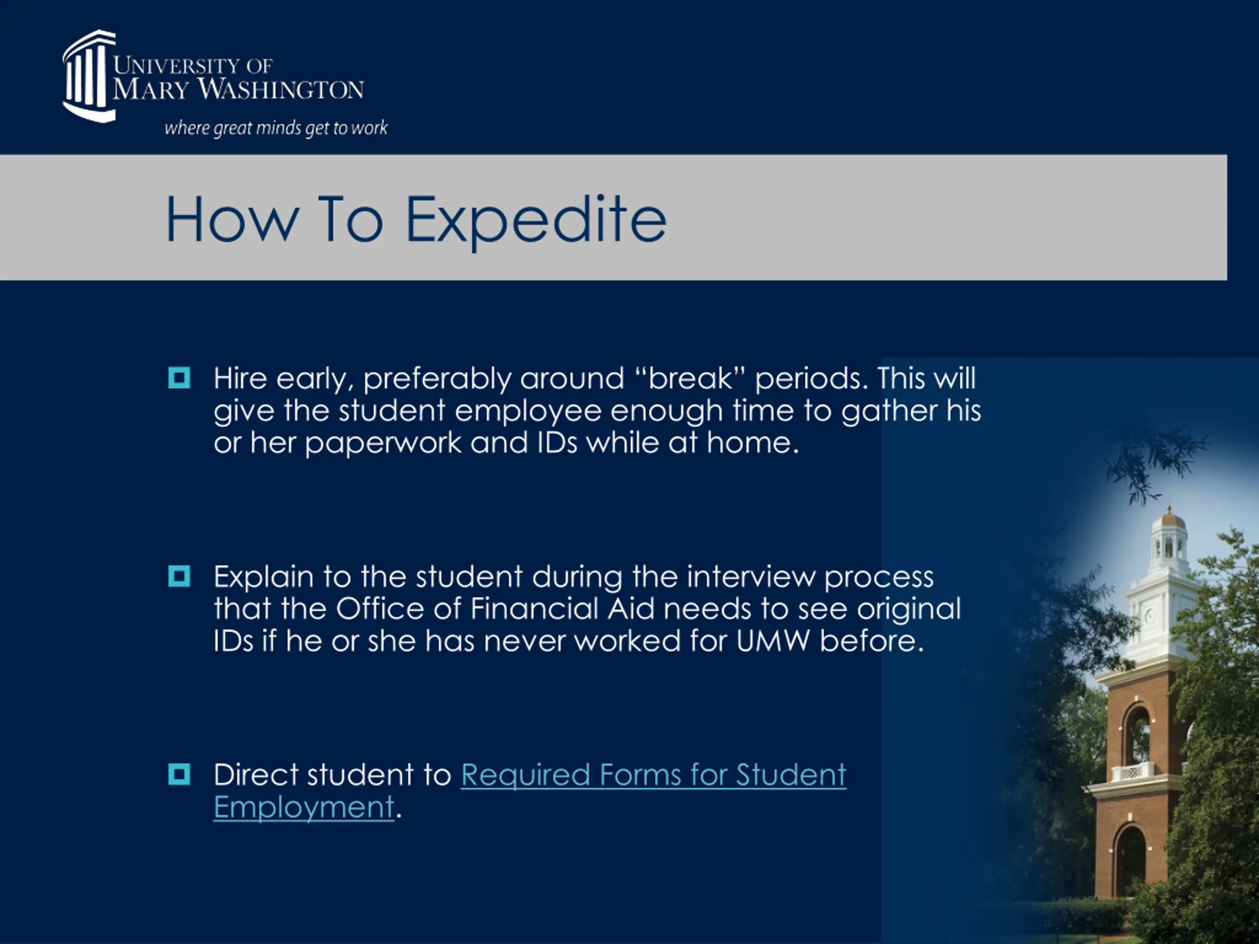 How To Expedite Hire early, preferably around break periods. This will give the student employee enough time to gather his or her paperwork and IDs while at home. Explain to the student during the interview process that the Office of Financial Aid needs to see original IDs if he or she has never worked for UMW before. Direct student to Required Forms for Student Employment.