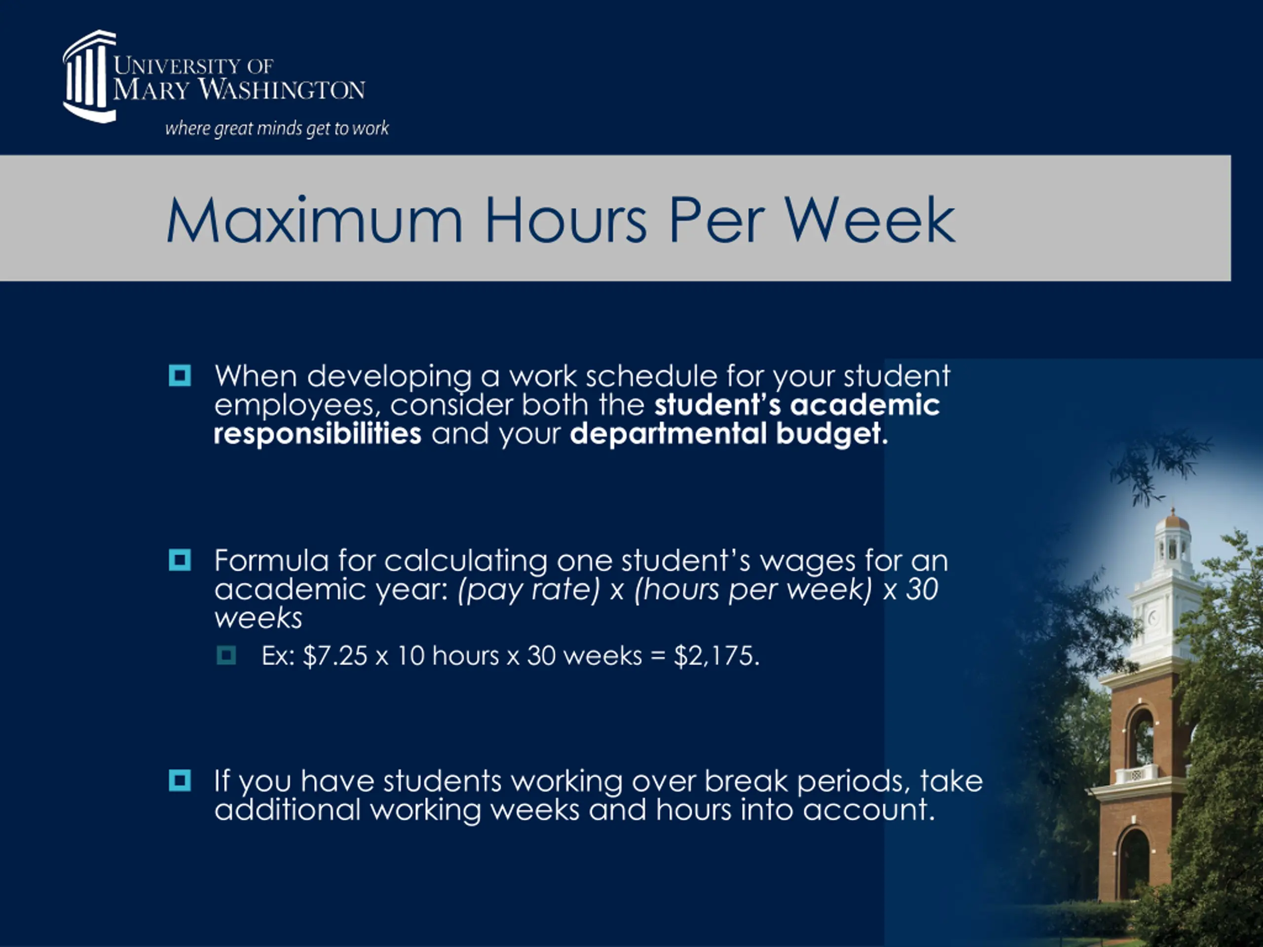 Maximum Hours Per Week When developing a work schedule for your student employees, consider both the student s academic responsibilities and your departmental budget. Formula for calculating one student s wages for an academic year: (pay rate) x (hours per week) x 30 weeks Ex: $7.25 x 10 hours x 30 weeks = $2,175. If you have students working over break periods, take additional working weeks and hours into account.