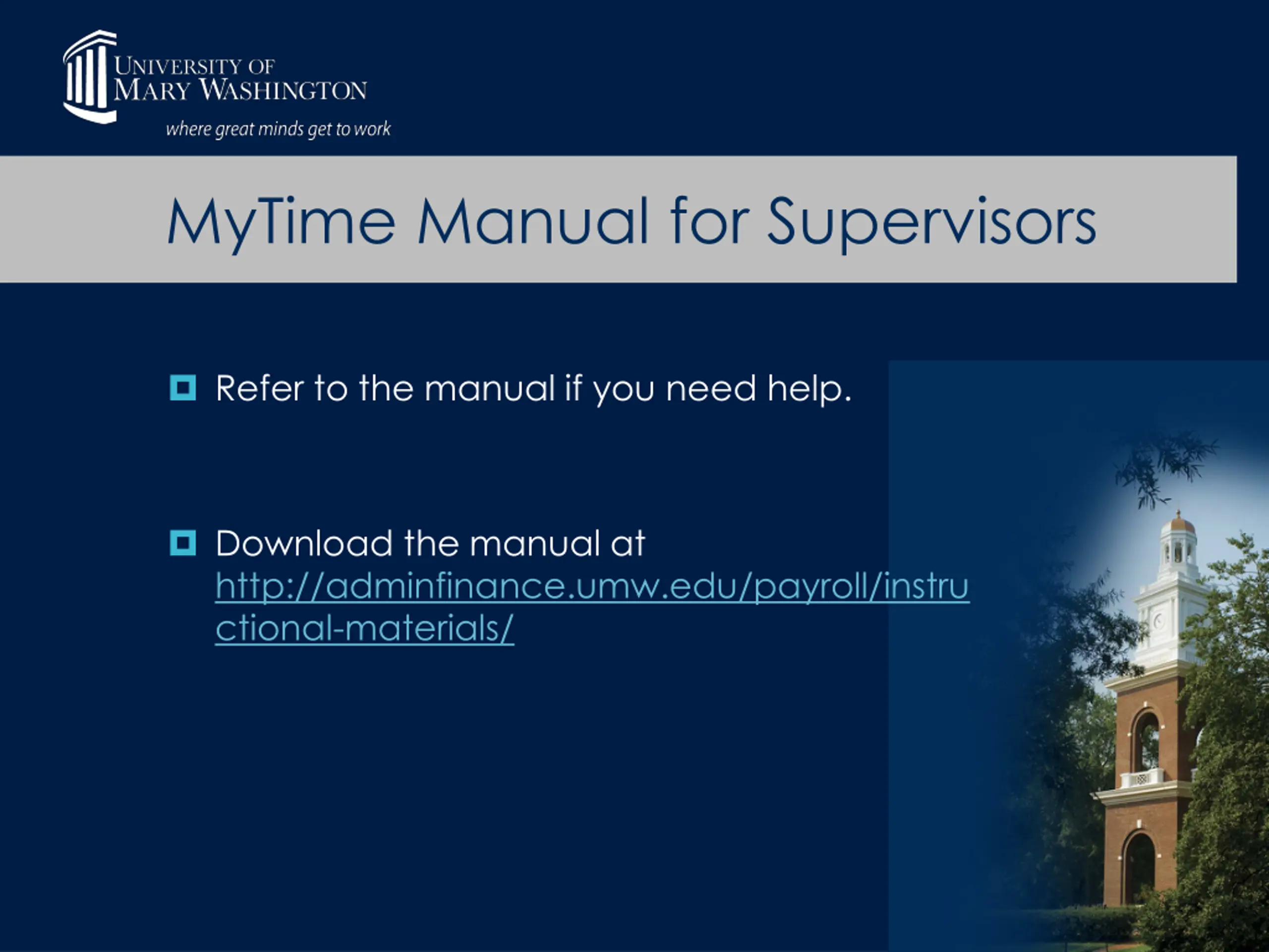 MyTime Manual for Supervisors Refer to the manual if you need help. Download the manual at http://adminfinance.umw.edu/payroll/instru ctional-materials/