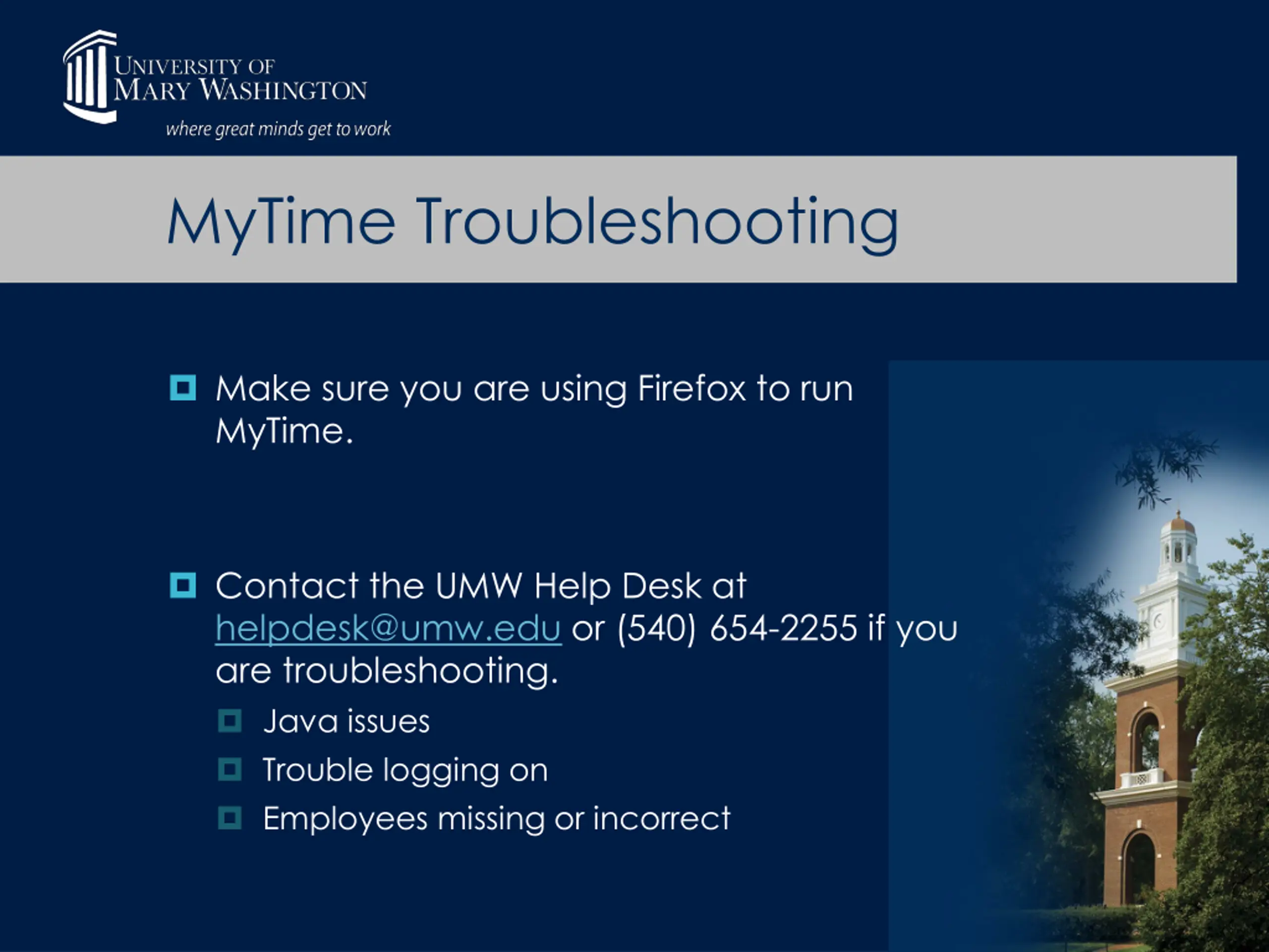 MyTime Troubleshooting Make sure you are using Firefox to run MyTime. Contact the UMW Help Desk at helpdesk@umw.edu or (540) 654-2255 if you are troubleshooting. Java issues Trouble logging on Employees missing or incorrect