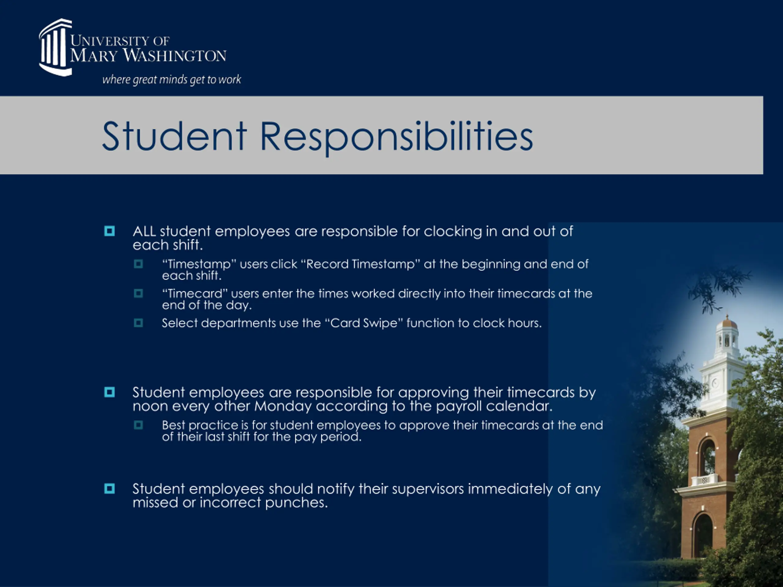 Student Responsibilities ALL student employees are responsible for clocking in and out of each shift. Timestamp users click Record Timestamp at the beginning and end of each shift. Timecard users enter the times worked directly into their timecards at the end of the day. Select departments use the Card Swipe function to clock hours. Student employees are responsible for approving their timecards by noon every other Monday according to the payroll calendar. Best practice is for student employees to approve their timecards at the end of their last shift for the pay period. Student employees should notify their supervisors immediately of any missed or incorrect punches.