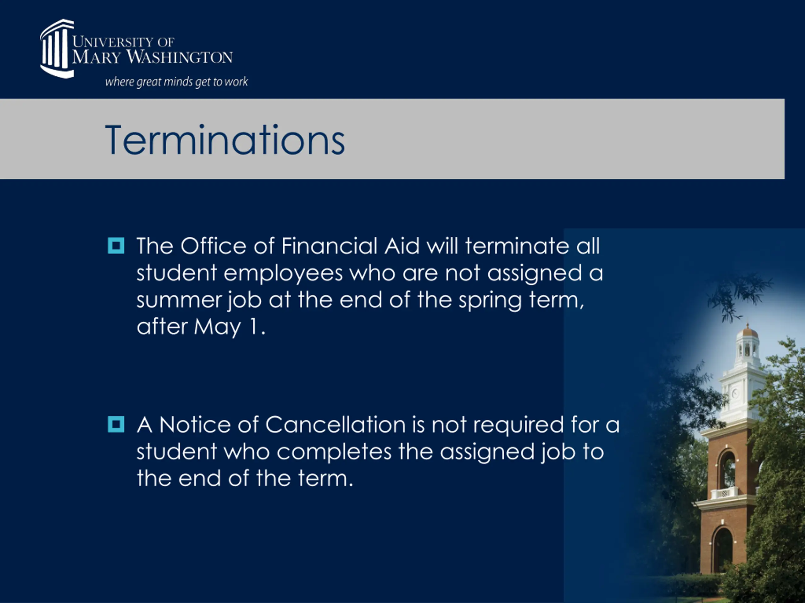 Terminations The Office of Financial Aid will terminate all student employees who are not assigned a summer job at the end of the spring term, after May 1. A Notice of Cancellation is not required for a student who completes the assigned job to the end of the term.