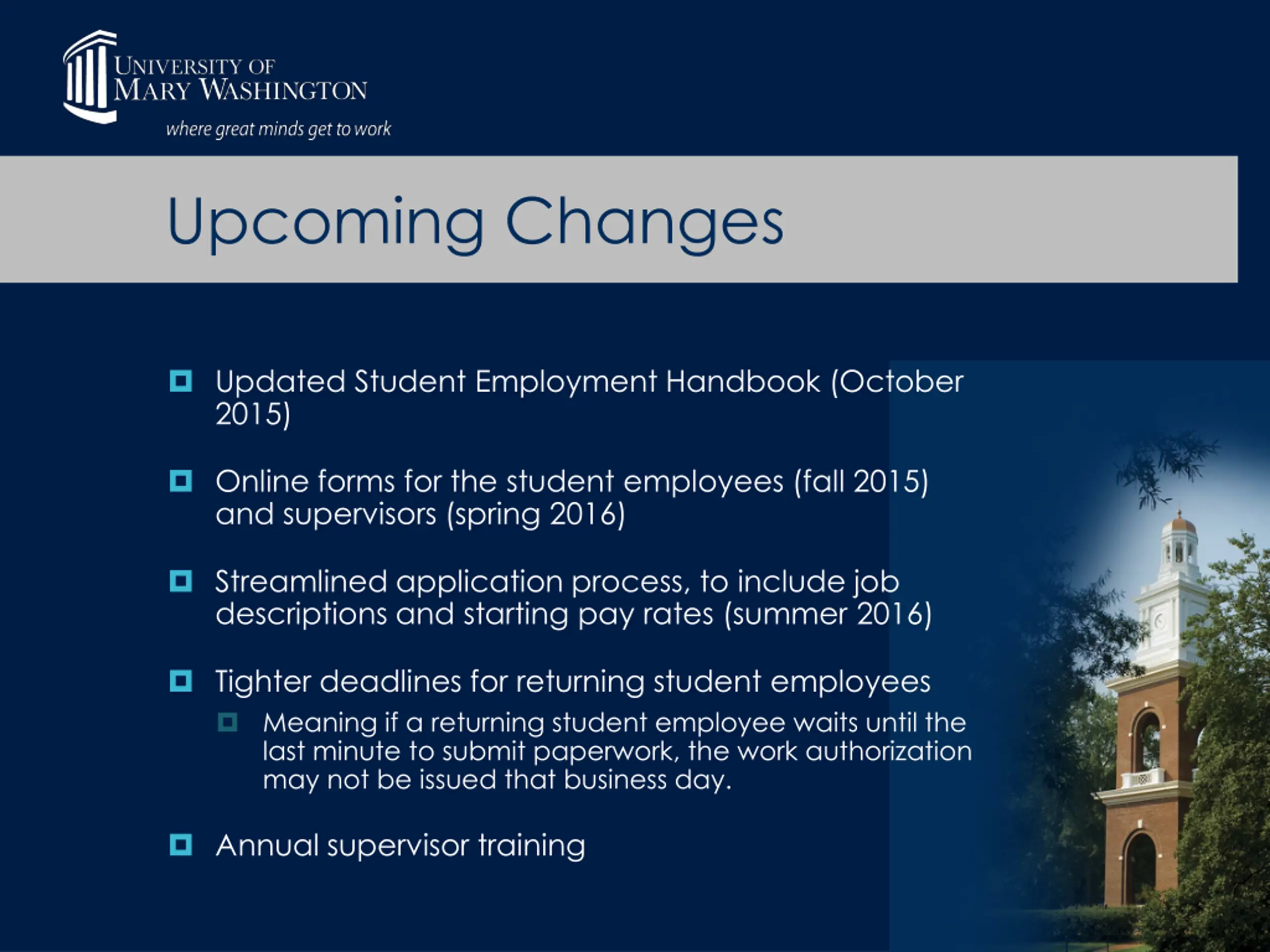 Upcoming Changes Updated Student Employment Handbook (October 2015) Online forms for the student employees (fall 2015) and supervisors (spring 2016) Streamlined application process, to include job descriptions and starting pay rates (summer 2016) Tighter deadlines for returning student employees Meaning if a returning student employee waits until the last minute to submit paperwork, the work authorization may not be issued that business day. Annual supervisor training
