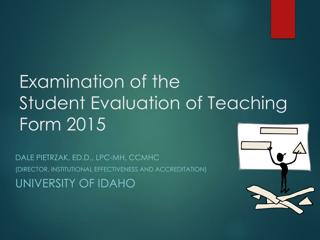 Examination of the Student Evaluation of Teaching Form 2015 DALE PIETRZAK, ED.D., LPC-MH, CCMHC (DIRECTOR, INSTITUTIONAL EFFECTIVENESS AND ACCREDITATION) UNIVERSITY OF IDAHO