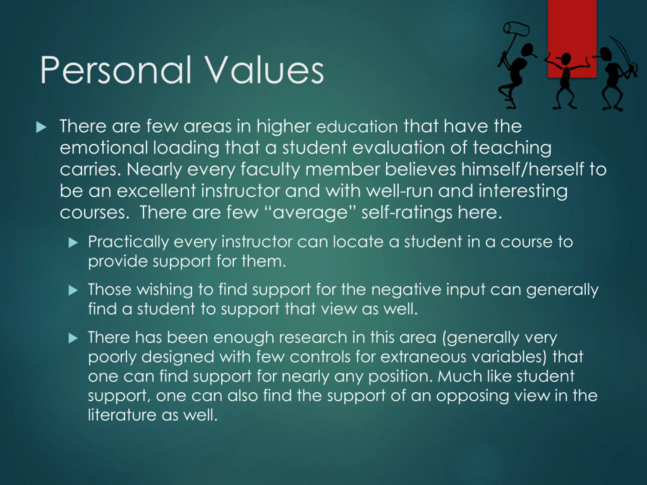 Personal Values There are few areas in higher education that have the emotional loading that a student evaluation of teaching carries. Nearly every faculty member believes himself/herself to be an excellent instructor and with well-run and interesting courses. There are few average self-ratings here. Practically every instructor can locate a student in a course to provide support for them. Those wishing to find support for the negative input can generally find a student to support that view as well. There has been enough research in this area (generally very poorly designed with few controls for extraneous variables) that one can find support for nearly any position. Much like student support, one can also find the support of an opposing view in the literature as well.