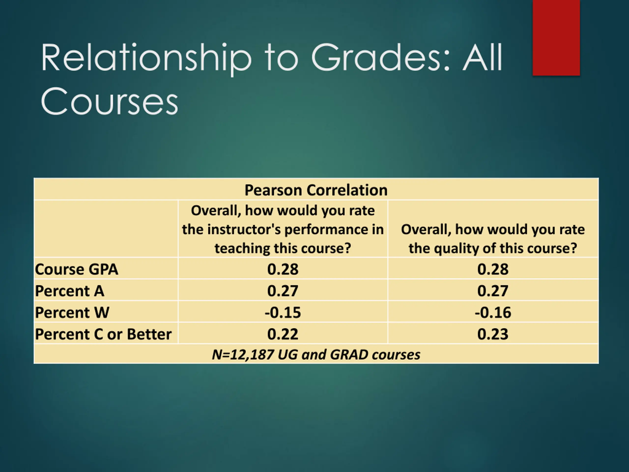 Relationship to Grades: All Courses Pearson Correlation Overall, how would you rate the instructor's performance in teaching this course? 0.28 0.27 -0.15 0.22 N=12,187 UG and GRAD courses Overall, how would you rate the quality of this course? 0.28 0.27 -0.16 0.23 Course GPA Percent A Percent W Percent C or Better