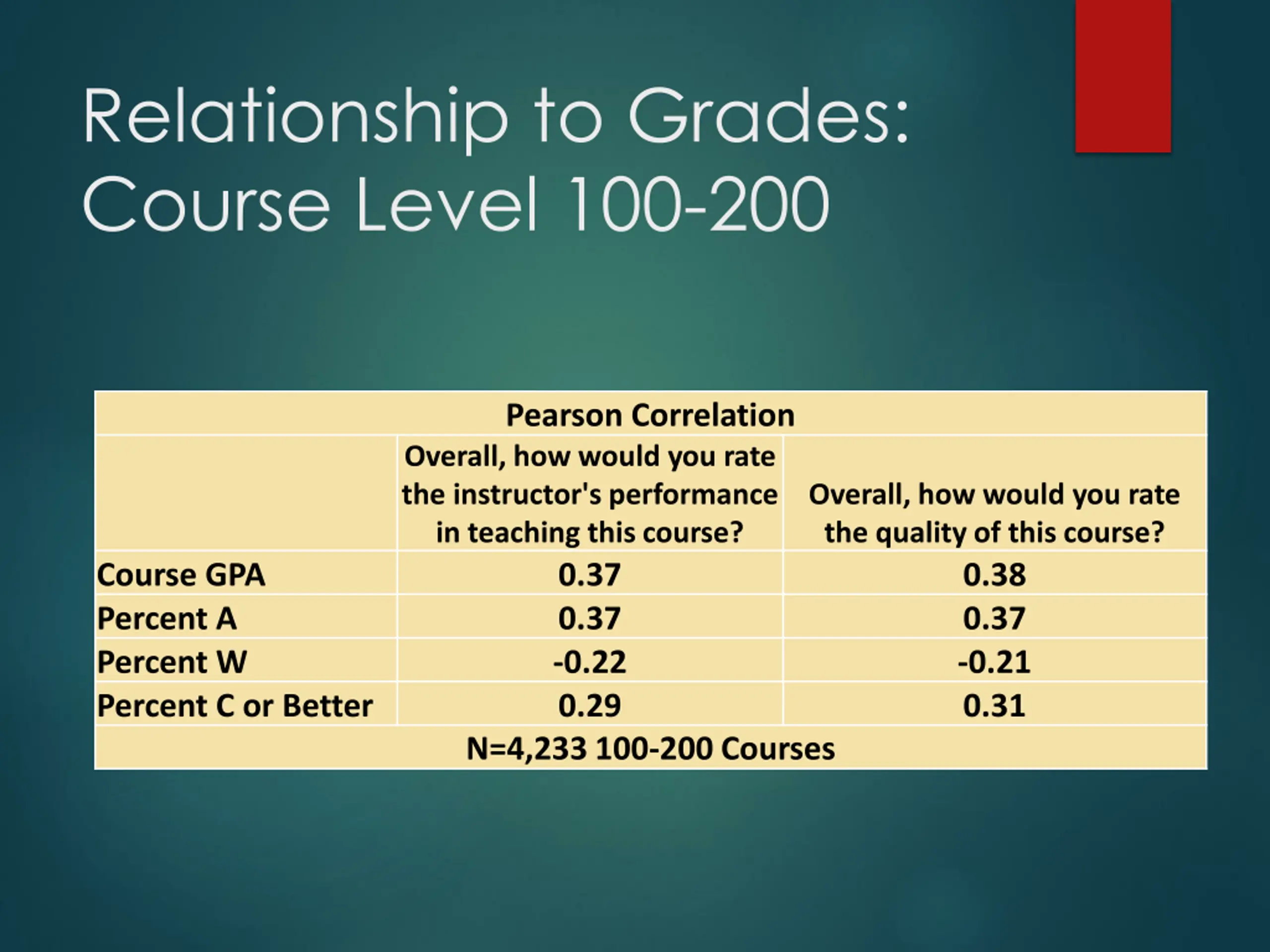 Relationship to Grades: Course Level 100-200 Pearson Correlation Overall, how would you rate the instructor's performance in teaching this course? 0.37 0.37 -0.22 0.29 N=4,233 100-200 Courses Overall, how would you rate the quality of this course? 0.38 0.37 -0.21 0.31 Course GPA Percent A Percent W Percent C or Better