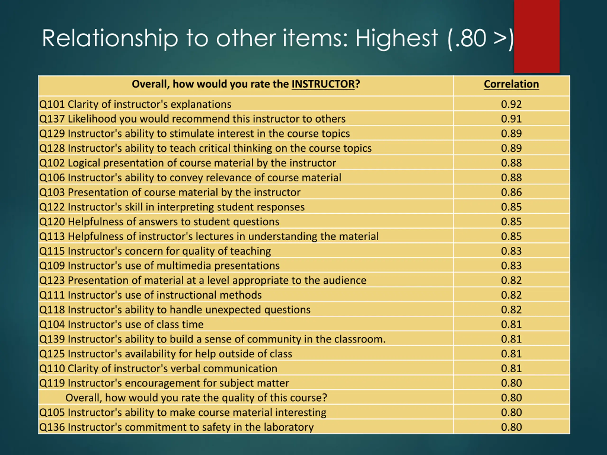 Relationship to other items: Highest (.80 >) Overall, how would you rate the INSTRUCTOR? Correlation Q101 Clarity of instructor's explanations Q137 Likelihood you would recommend this instructor to others Q129 Instructor's ability to stimulate interest in the course topics Q128 Instructor's ability to teach critical thinking on the course topics Q102 Logical presentation of course material by the instructor Q106 Instructor's ability to convey relevance of course material Q103 Presentation of course material by the instructor Q122 Instructor's skill in interpreting student responses Q120 Helpfulness of answers to student questions Q113 Helpfulness of instructor's lectures in understanding the material Q115 Instructor's concern for quality of teaching Q109 Instructor's use of multimedia presentations Q123 Presentation of material at a level appropriate to the audience Q111 Instructor's use of instructional methods Q118 Instructor's ability to handle unexpected questions Q104 Instructor's use of class time Q139 Instructor's ability to build a sense of community in the classroom. Q125 Instructor's availability for help outside of class Q110 Clarity of instructor's verbal communication Q119 Instructor's encouragement for subject matter Overall, how would you rate the quality of this course? Q105 Instructor's ability to make course material interesting Q136 Instructor's commitment to safety in the laboratory 0.92 0.91 0.89 0.89 0.88 0.88 0.86 0.85 0.85 0.85 0.83 0.83 0.82 0.82 0.82 0.81 0.81 0.81 0.81 0.80 0.80 0.80 0.80