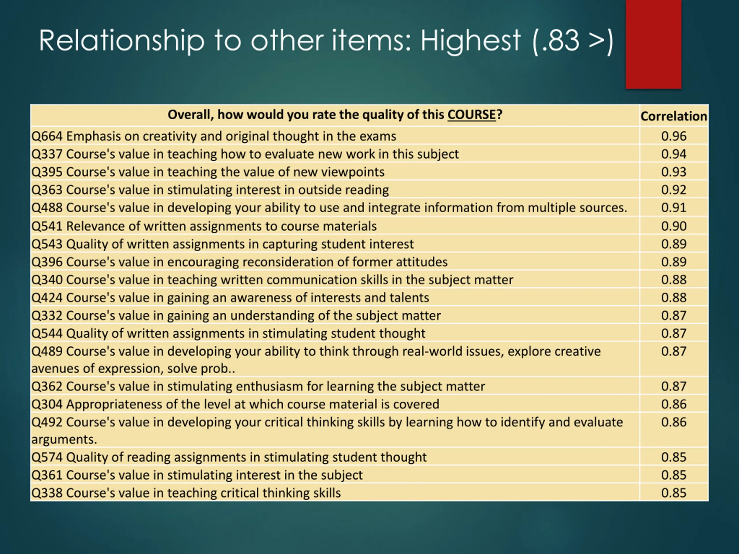Relationship to other items: Highest (.83 >) Overall, how would you rate the quality of this COURSE? Correlation 0.96 0.94 0.93 0.92 0.91 0.90 0.89 0.89 0.88 0.88 0.87 0.87 0.87 Q664 Emphasis on creativity and original thought in the exams Q337 Course's value in teaching how to evaluate new work in this subject Q395 Course's value in teaching the value of new viewpoints Q363 Course's value in stimulating interest in outside reading Q488 Course's value in developing your ability to use and integrate information from multiple sources. Q541 Relevance of written assignments to course materials Q543 Quality of written assignments in capturing student interest Q396 Course's value in encouraging reconsideration of former attitudes Q340 Course's value in teaching written communication skills in the subject matter Q424 Course's value in gaining an awareness of interests and talents Q332 Course's value in gaining an understanding of the subject matter Q544 Quality of written assignments in stimulating student thought Q489 Course's value in developing your ability to think through real-world issues, explore creative avenues of expression, solve prob.. Q362 Course's value in stimulating enthusiasm for learning the subject matter Q304 Appropriateness of the level at which course material is covered Q492 Course's value in developing your critical thinking skills by learning how to identify and evaluate arguments. Q574 Quality of reading assignments in stimulating student thought Q361 Course's value in stimulating interest in the subject Q338 Course's value in teaching critical thinking skills 0.87 0.86 0.86 0.85 0.85 0.85