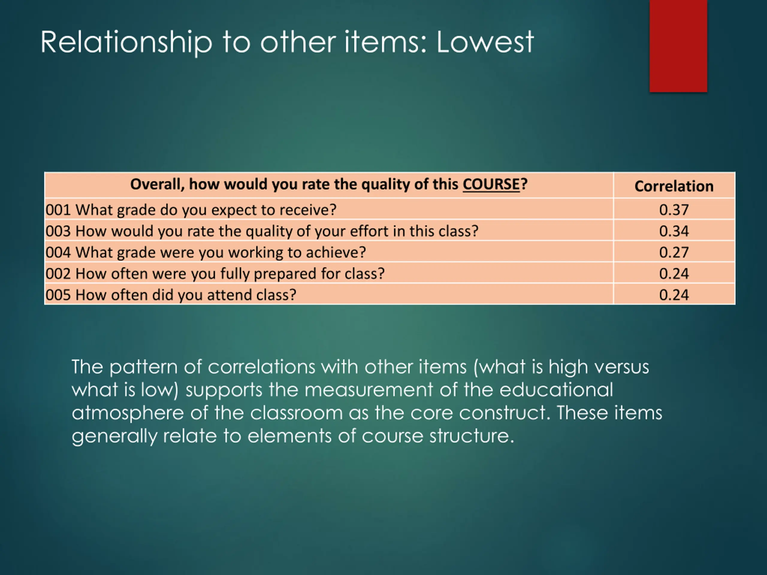 Relationship to other items: Lowest Overall, how would you rate the quality of this COURSE? Correlation 0.37 0.34 0.27 0.24 0.24 001 What grade do you expect to receive? 003 How would you rate the quality of your effort in this class? 004 What grade were you working to achieve? 002 How often were you fully prepared for class? 005 How often did you attend class? The pattern of correlations with other items (what is high versus what is low) supports the measurement of the educational atmosphere of the classroom as the core construct. These items generally relate to elements of course structure.