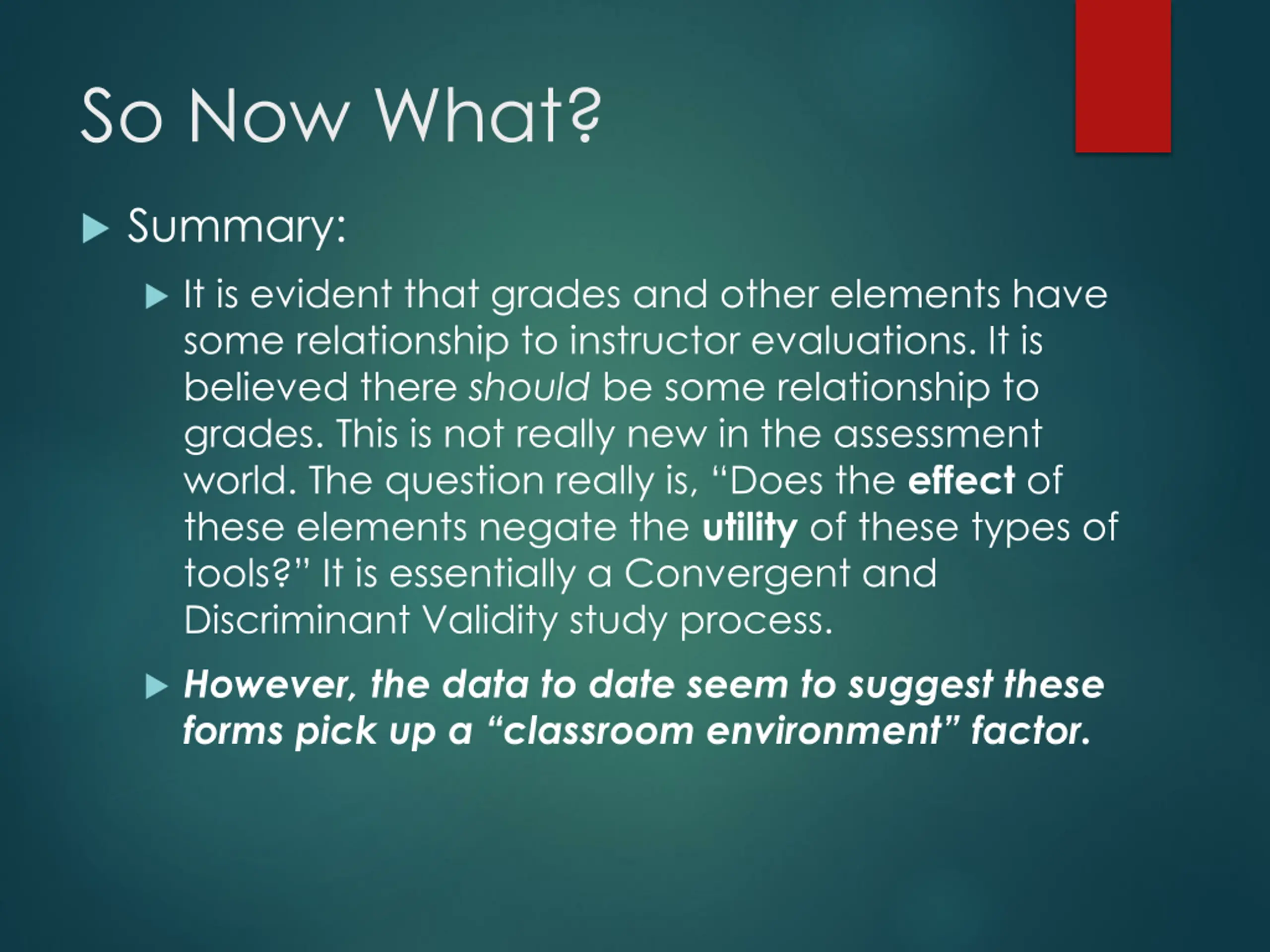 So Now What? Summary: It is evident that grades and other elements have some relationship to instructor evaluations. It is believed there should be some relationship to grades. This is not really new in the assessment world. The question really is, Does the effect of these elements negate the utility of these types of tools? It is essentially a Convergent and Discriminant Validity study process. However, the data to date seem to suggest these forms pick up a classroom environment factor.