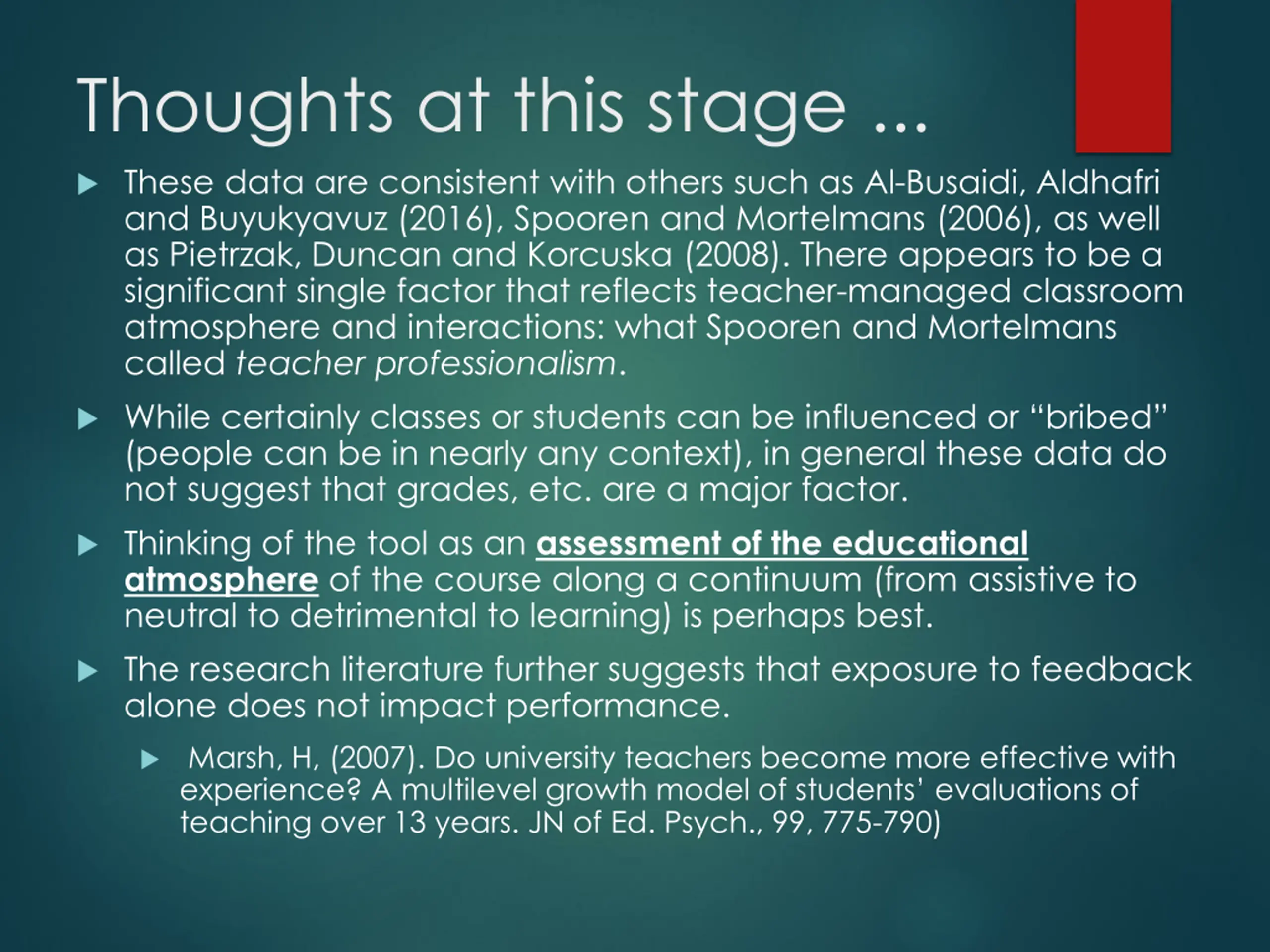 Thoughts at this stage ... These data are consistent with others such as Al-Busaidi, Aldhafri and Buyukyavuz (2016), Spooren and Mortelmans (2006), as well as Pietrzak, Duncan and Korcuska (2008). There appears to be a significant single factor that reflects teacher-managed classroom atmosphere and interactions: what Spooren and Mortelmans called teacher professionalism. While certainly classes or students can be influenced or bribed (people can be in nearly any context), in general these data do not suggest that grades, etc. are a major factor. Thinking of the tool as an assessment of the educational atmosphere of the course along a continuum (from assistive to neutral to detrimental to learning) is perhaps best. The research literature further suggests that exposure to feedback alone does not impact performance. Marsh, H, (2007). Do university teachers become more effective with experience? A multilevel growth model of students evaluations of teaching over 13 years. JN of Ed. Psych., 99, 775-790)