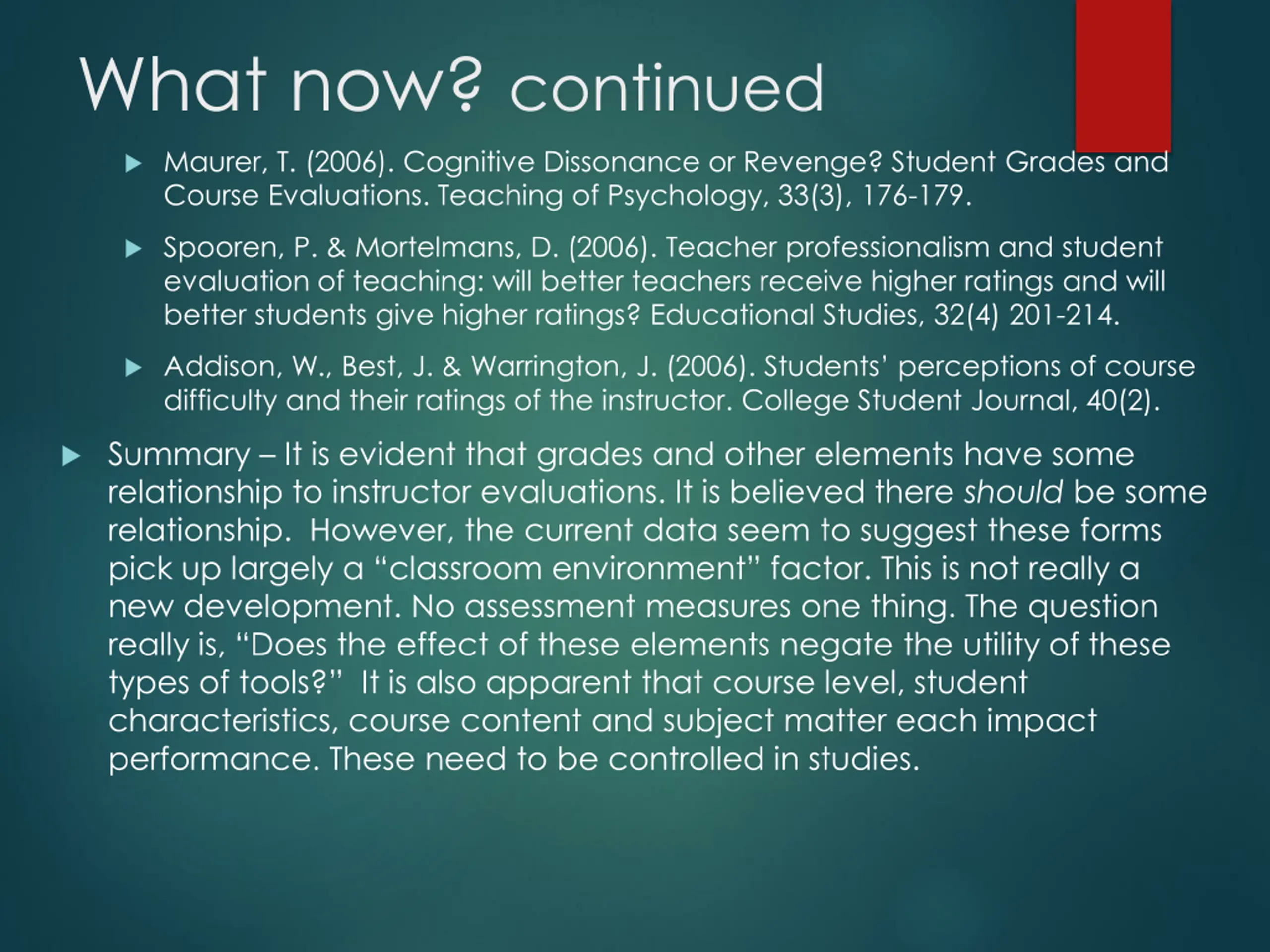 What now? continued Maurer, T. (2006). Cognitive Dissonance or Revenge? Student Grades and Course Evaluations. Teaching of Psychology, 33(3), 176-179. Spooren, P. & Mortelmans, D. (2006). Teacher professionalism and student evaluation of teaching: will better teachers receive higher ratings and will better students give higher ratings? Educational Studies, 32(4) 201-214. Addison, W., Best, J. & Warrington, J. (2006). Students perceptions of course difficulty and their ratings of the instructor. College Student Journal, 40(2). Summary It is evident that grades and other elements have some relationship to instructor evaluations. It is believed there should be some relationship. However, the current data seem to suggest these forms pick up largely a classroom environment factor. This is not really a new development. No assessment measures one thing. The question really is, Does the effect of these elements negate the utility of these types of tools? It is also apparent that course level, student characteristics, course content and subject matter each impact performance. These need to be controlled in studies.