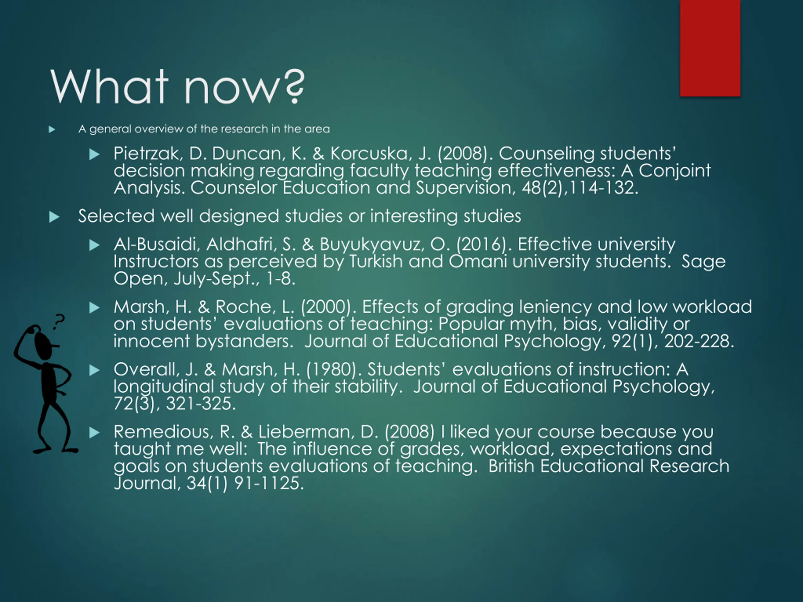 What now? A general overview of the research in the area Pietrzak, D. Duncan, K. & Korcuska, J. (2008). Counseling students decision making regarding faculty teaching effectiveness: A Conjoint Analysis. Counselor Education and Supervision, 48(2),114-132. Selected well designed studies or interesting studies Al-Busaidi, Aldhafri, S. & Buyukyavuz, O. (2016). Effective university Instructors as perceived by Turkish and Omani university students. Sage Open, July-Sept., 1-8. Marsh, H. & Roche, L. (2000). Effects of grading leniency and low workload on students evaluations of teaching: Popular myth, bias, validity or innocent bystanders. Journal of Educational Psychology, 92(1), 202-228. Overall, J. & Marsh, H. (1980). Students evaluations of instruction: A longitudinal study of their stability. Journal of Educational Psychology, 72(3), 321-325. Remedious, R. & Lieberman, D. (2008) I liked your course because you taught me well: The influence of grades, workload, expectations and goals on students evaluations of teaching. British Educational Research Journal, 34(1) 91-1125.
