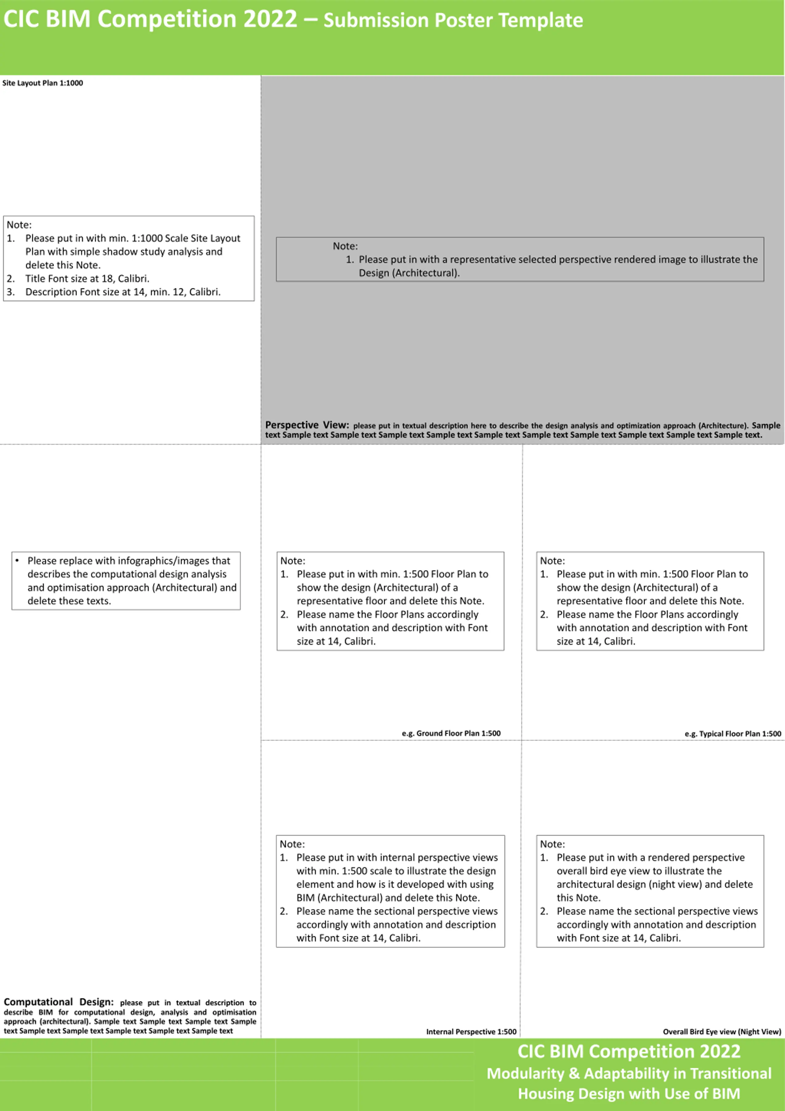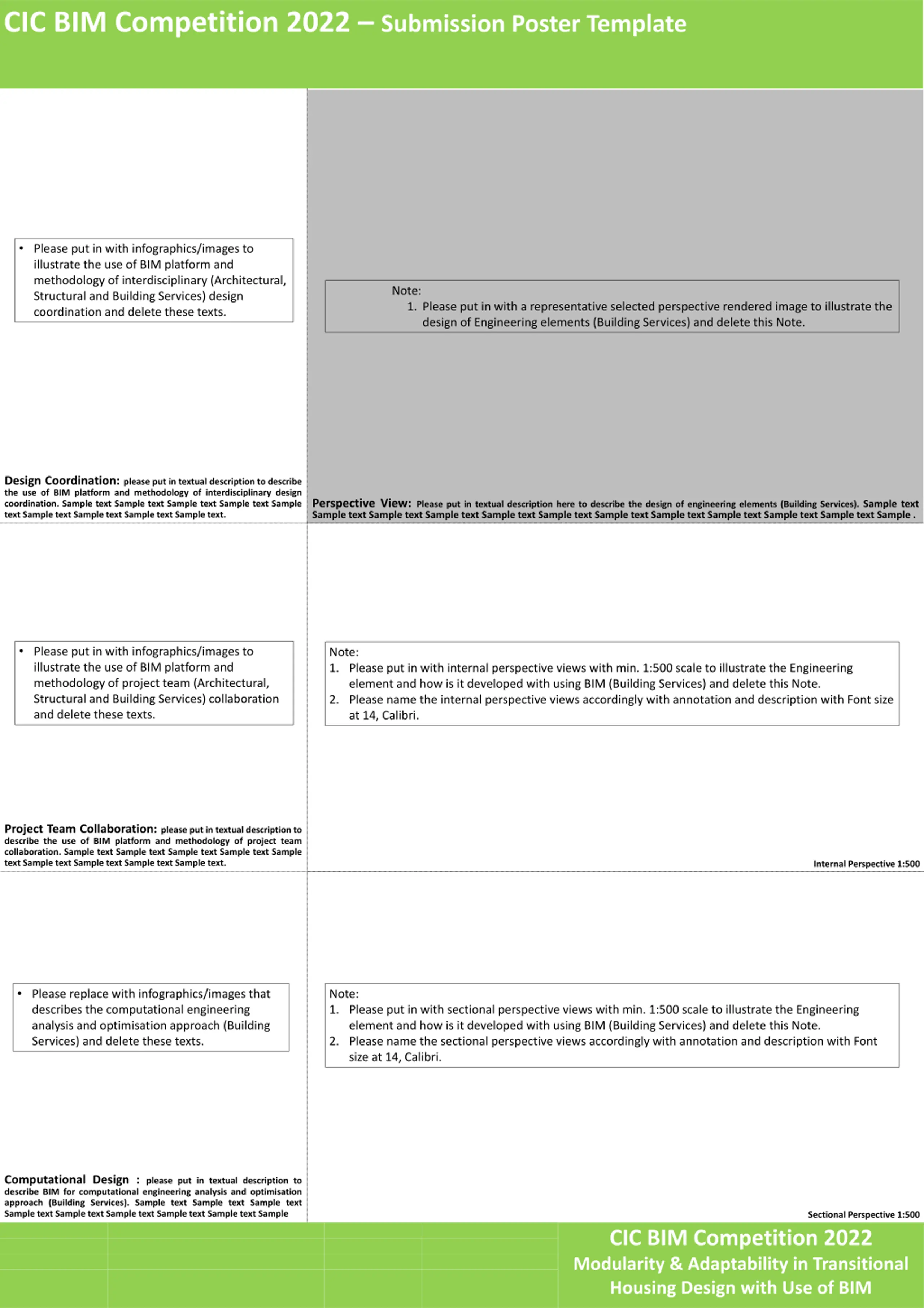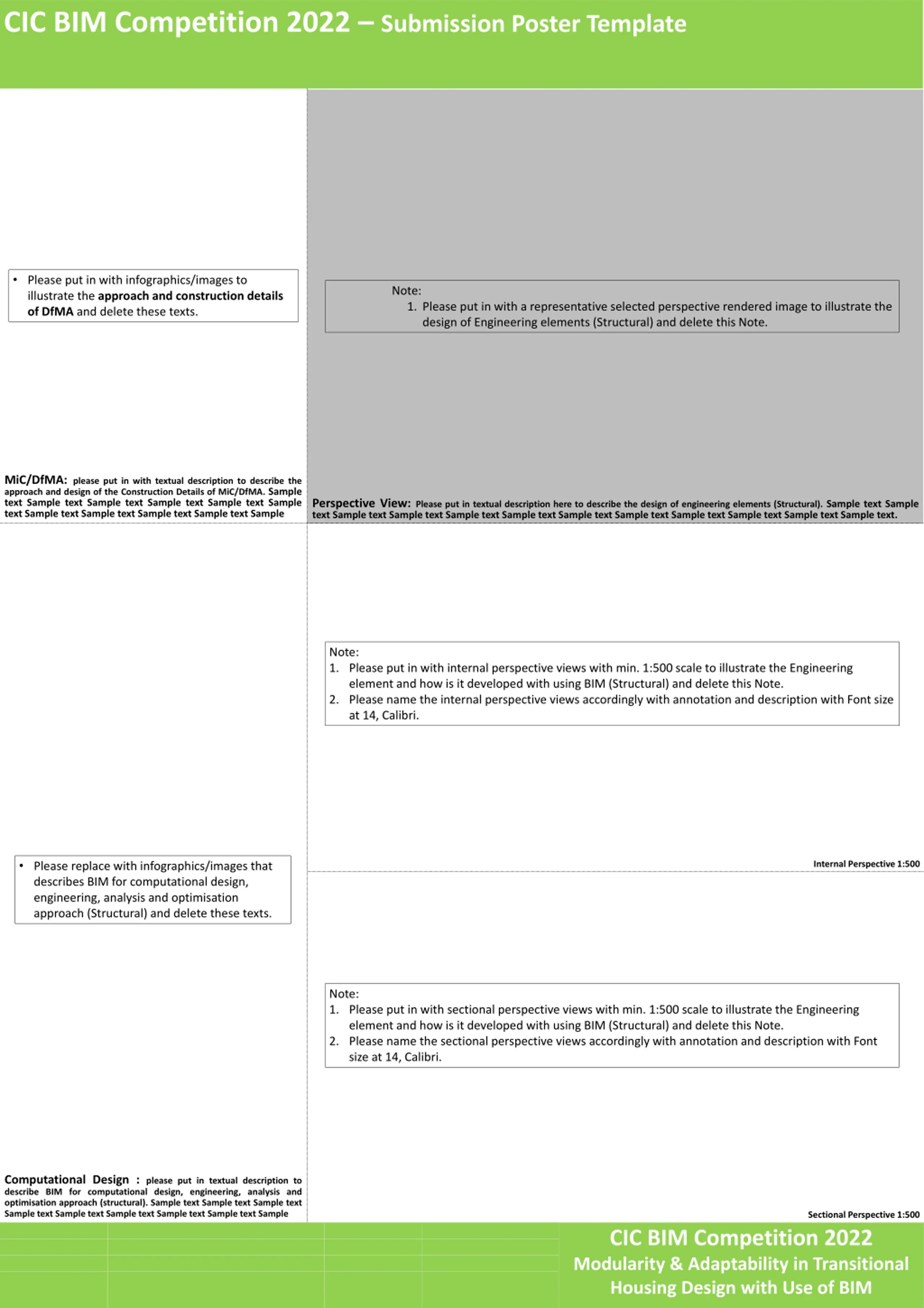 CIC BIM Competition 2022 Submission Poster Template Please put in with infographics/images to illustrate the use of BIM platform and methodology of interdisciplinary (Architectural, Structural and Building Services) design coordination and delete these texts. Note: 1. Please put in with a representative selected perspective rendered image to illustrate the design of Engineering elements (Building Services) and delete this Note. Design Coordination: please put in textual description to describe the use of BIM platform and methodology of interdisciplinary design coordination. Sample text Sample text Sample text Sample text Sample text Sample text Sample text Sample text Sample text. Perspective View: Please put in textual description here to describe the design of engineering elements (Building Services). Sample text Sample text Sample text Sample text Sample text Sample text Sample text Sample text Sample text Sample text Sample text Sample . Please put in with infographics/images to illustrate the use of BIM platform and methodology of project team (Architectural, Structural and Building Services) collaboration and delete these texts. Note: 1. Please put in with internal perspective views with min. 1:500 scale to illustrate the Engineering element and how is it developed with using BIM (Building Services) and delete this Note. 2. Please name the internal perspective views accordingly with annotation and description with Font size at 14, Calibri. Project Team Collaboration: please put in textual description to describe the use of BIM platform and methodology of project team collaboration. Sample text Sample text Sample text Sample text Sample text Sample text Sample text Sample text Sample text. Internal Perspective 1:500 Please replace with infographics/images that describes the computational engineering analysis and optimisation approach (Building Services)and delete these texts. Note: 1. Please put in with sectional perspective views with min. 1:500 scale to illustrate the Engineering element and how is it developed with using BIM (Building Services) and delete this Note. 2. Please name the sectional perspective views accordingly with annotation and description with Font size at 14, Calibri. Computational Design : please put in textual description to describe BIM for computational engineering analysis and optimisation approach (Building Services). Sample text Sample text Sample text Sample text Sample text Sample text Sample text Sample text Sample Sectional Perspective 1:500 CIC BIM Competition 2022 Modularity & Adaptability in Transitional Housing Design with Use of BIM