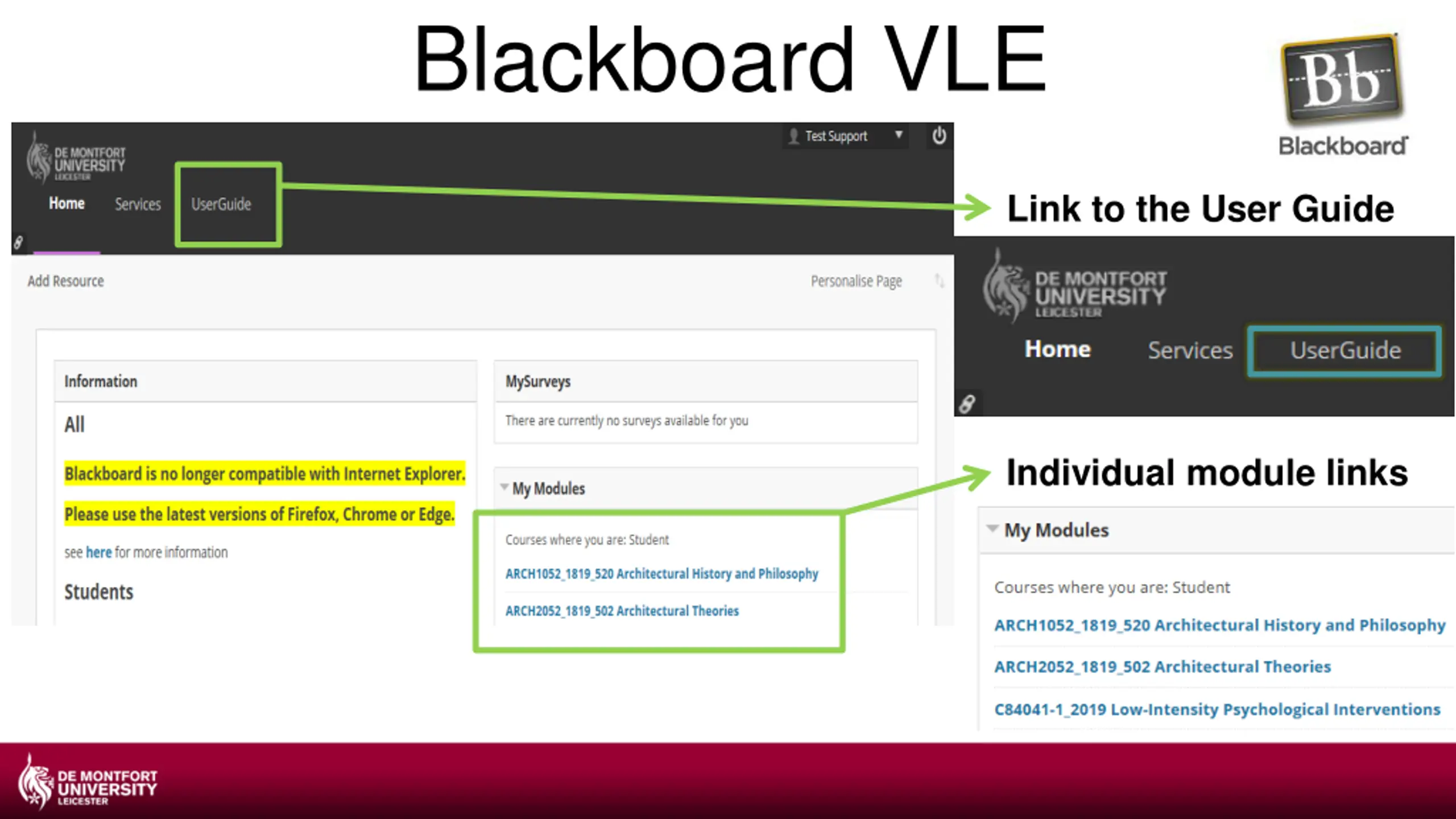 Blackboard VLE Or you can access it directly via your web browser at: https://vle.dmu.ac.uk Blackboard is NOT compatible with the Internet Explorer web browser It is compatible with the latest versions of Google Chrome, Firefox, Microsoft Edge, and Safari.