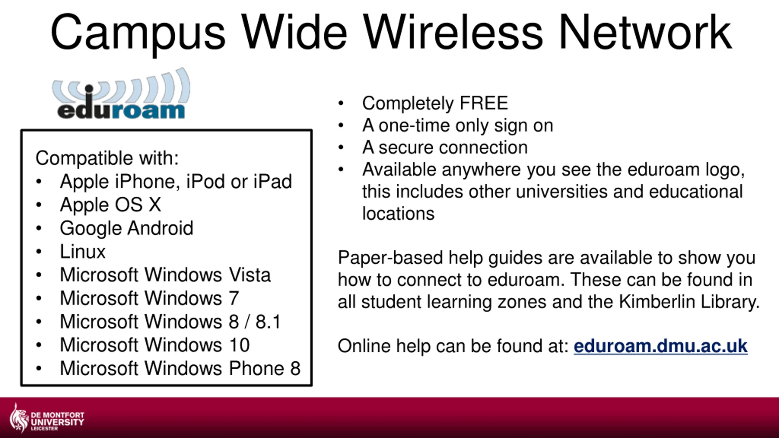 Campus Wide Wireless Network Completely FREE A one-time only sign on A secure connection Available anywhere you see the eduroam logo, this includes other universities and educational locations Compatible with: Apple iPhone, iPod or iPad Apple OS X Google Android Linux Microsoft Windows Vista Microsoft Windows 7 Microsoft Windows 8 / 8.1 Microsoft Windows 10 Microsoft Windows Phone 8 Paper-based help guides are available to show you how to connect to eduroam. These can be found in all student learning zones and the Kimberlin Library. Online help can be found at: eduroam.dmu.ac.uk