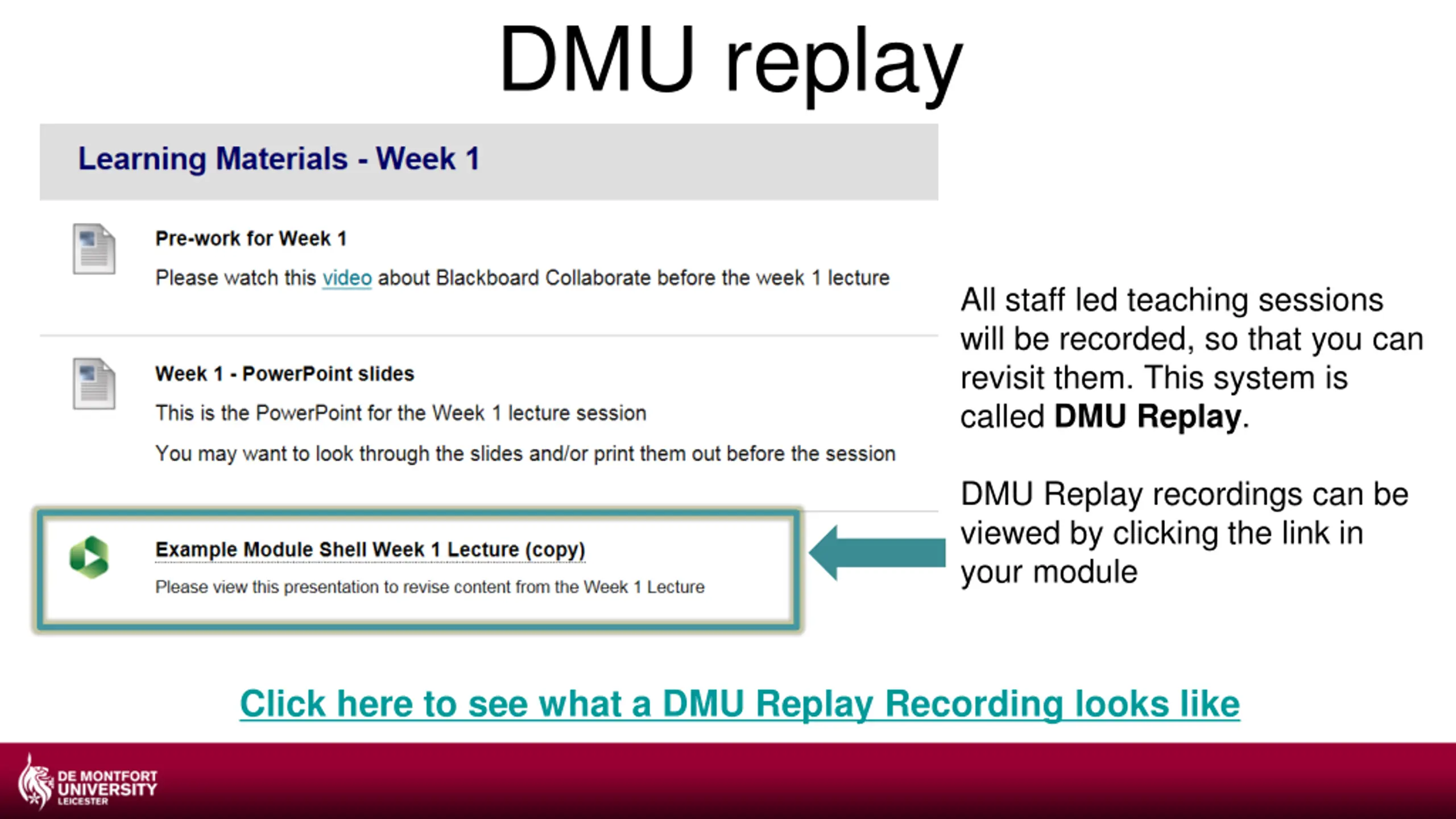 DMU replay All staff led teaching sessions will be recorded, so that you can revisit them. This system is called DMU Replay. DMU Replay recordings can be viewed by clicking the link in your module Click here to see what a DMU Replay Recording looks like