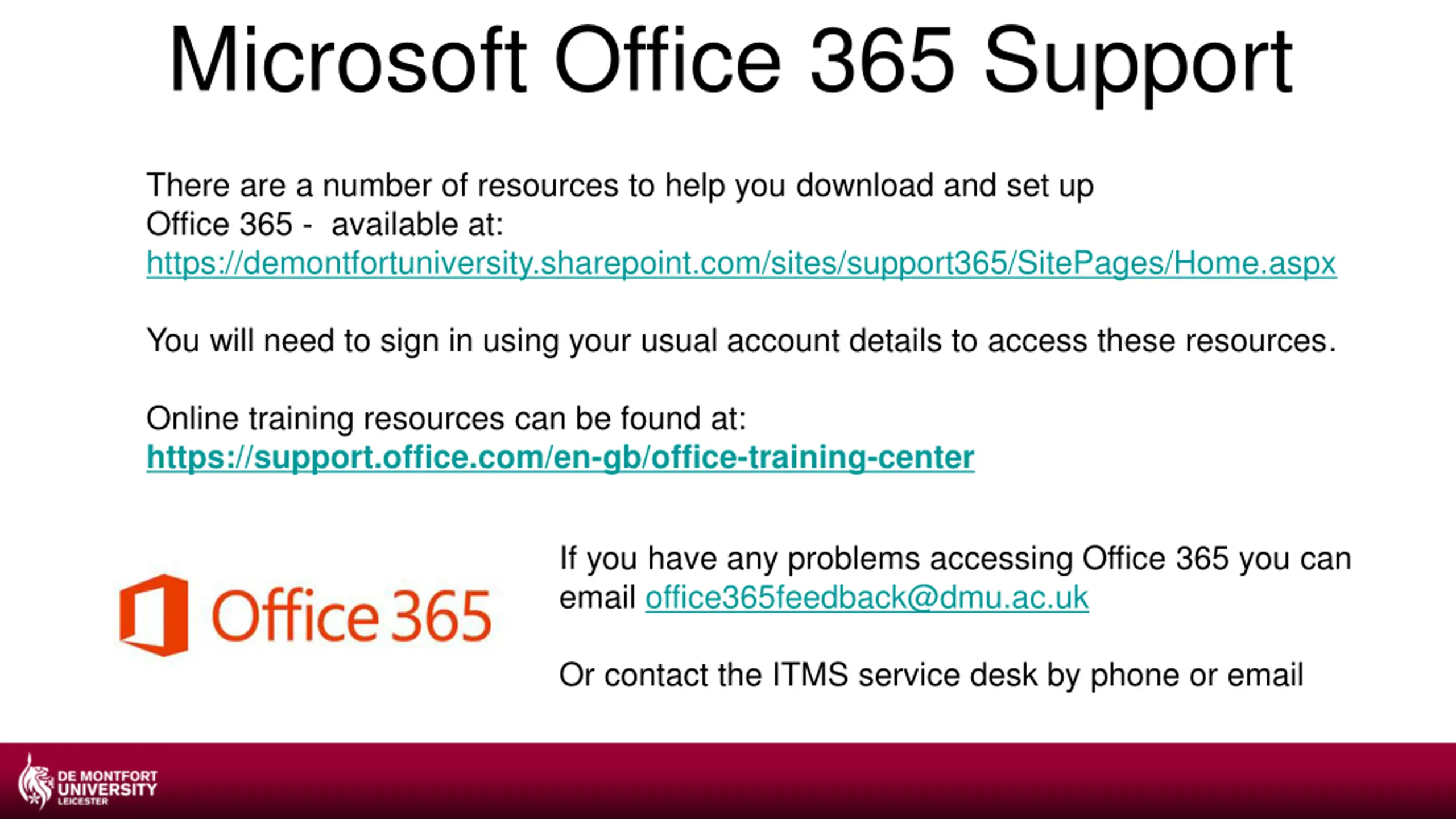 Microsoft Office 365 Support There are a number of resources to help you download and set up Office 365 - available at: https://demontfortuniversity.sharepoint.com/sites/support365/SitePages/Home.aspx You will need to sign in using your usual account details to access these resources. Online training resources can be found at: https://support.office.com/en-gb/office-training-center If you have any problems accessing Office 365 you can email office365feedback@dmu.ac.uk Or contact the ITMS service desk by phone or email