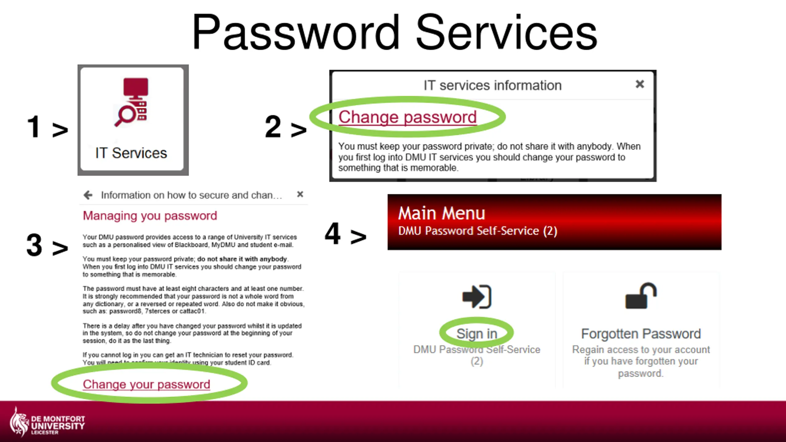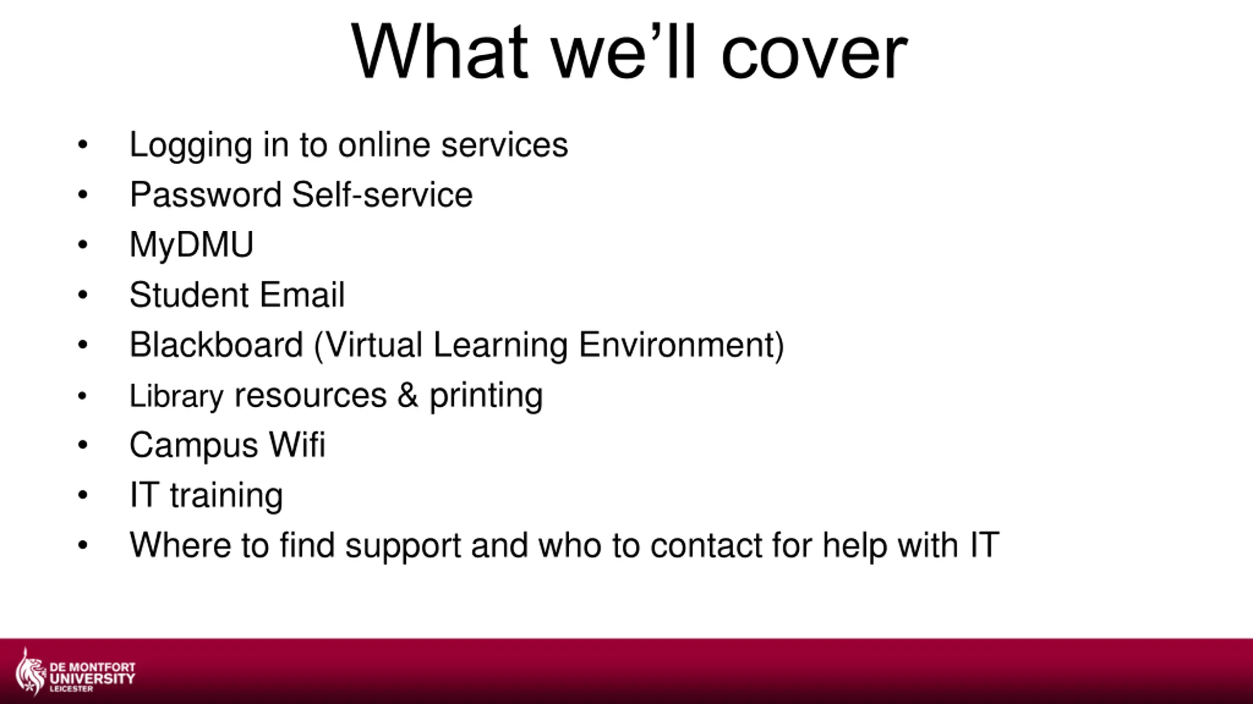 What well cover Logging in to online services Password Self-service MyDMU Student Email Blackboard (Virtual Learning Environment) Library resources & printing Campus Wifi IT training Where to find support and who to contact for help with IT