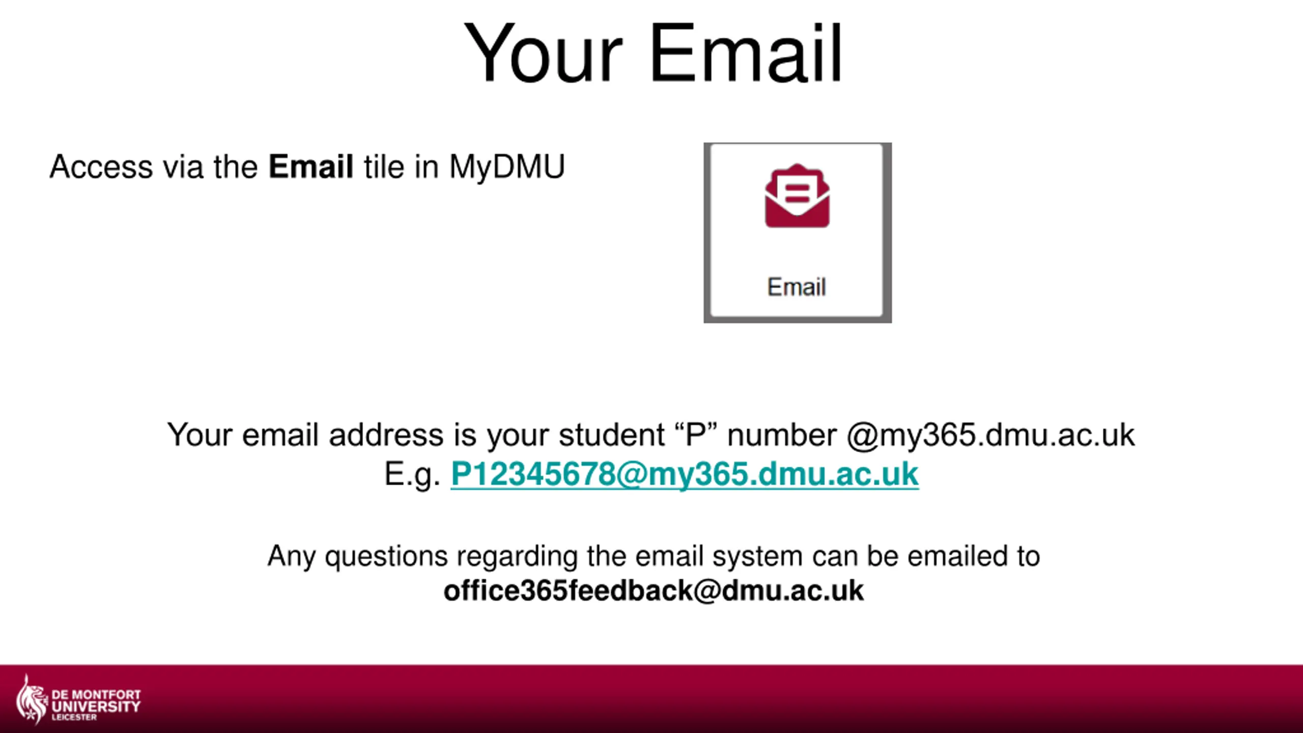 Your Email Access via the Email tile in MyDMU Your email address is your student P number @my365.dmu.ac.uk E.g. P12345678@my365.dmu.ac.uk Any questions regarding the email system can be emailed to office365feedback@dmu.ac.uk