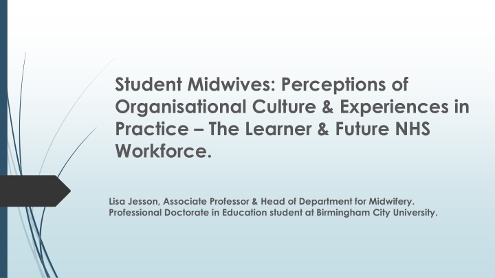 Student Midwives: Perceptions of Organisational Culture & Experiences in Practice The Learner & Future NHS Workforce. Lisa Jesson, Associate Professor & Head of Department for Midwifery. Professional Doctorate in Education student at Birmingham City University.