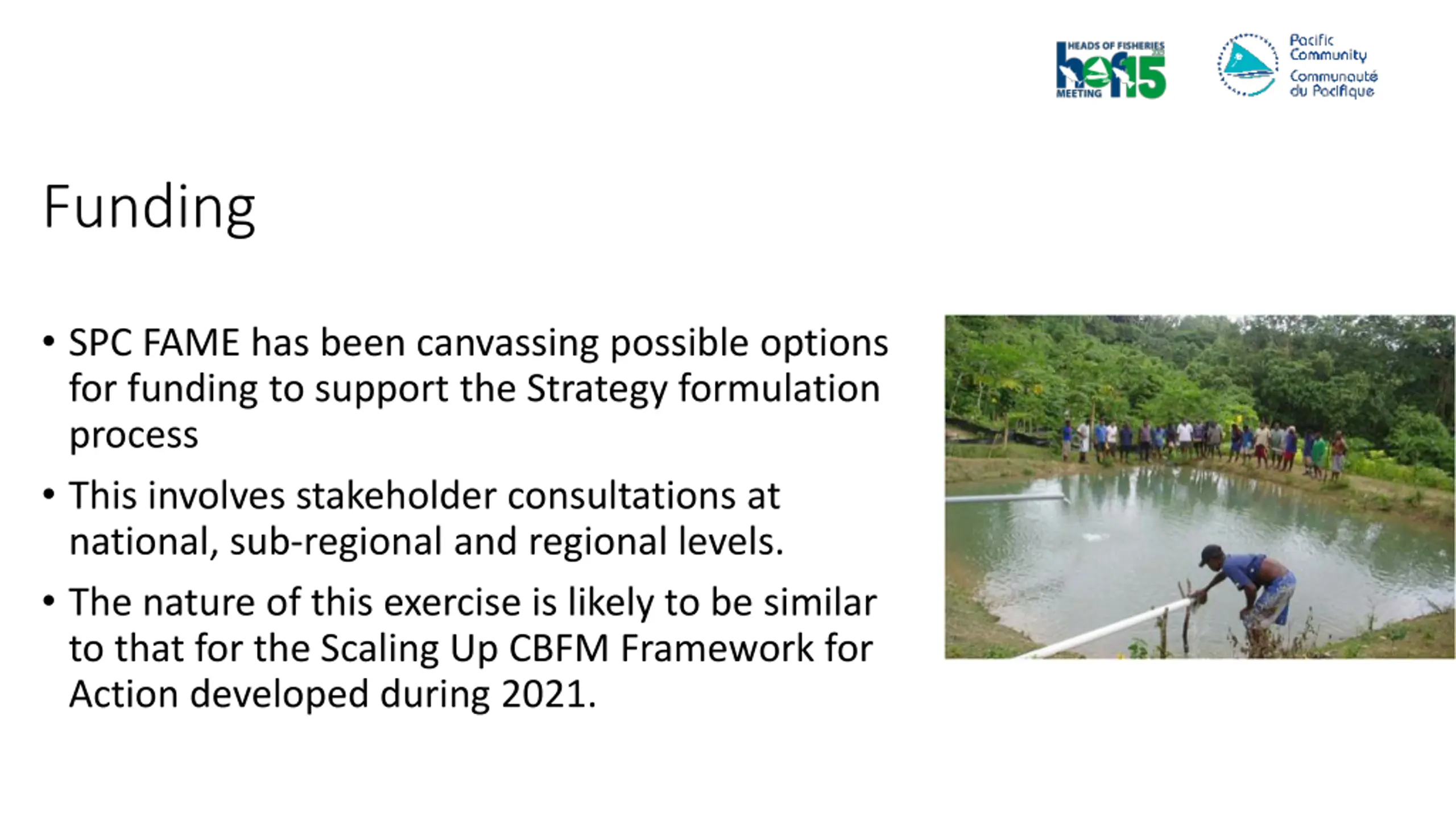Funding SPC FAME has been canvassing possible options for funding to support the Strategy formulation process This involves stakeholder consultations at national, sub-regional and regional levels. The nature of this exercise is likely to be similar to that for the Scaling Up CBFM Framework for Action developed during 2021.