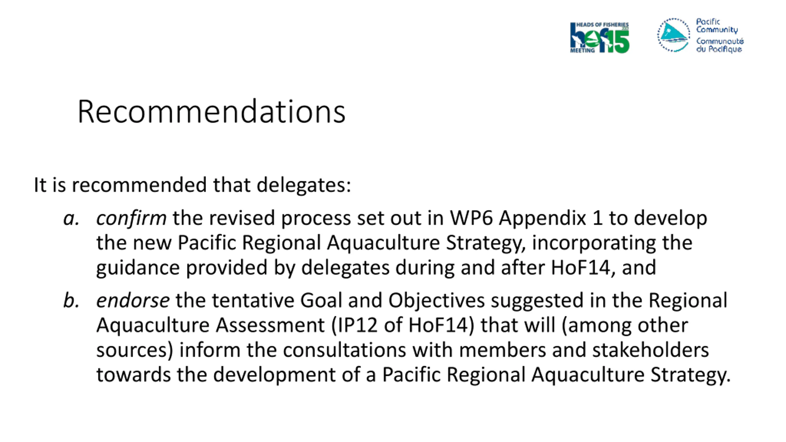 Recommendations It is recommended that delegates: a. confirm the revised process set out in WP6 Appendix 1 to develop the new Pacific Regional Aquaculture Strategy, incorporating the guidance provided by delegates during and after HoF14, and b. endorse the tentative Goal and Objectives suggested in the Regional Aquaculture Assessment (IP12 of HoF14) that will (among other sources) inform the consultations with members and stakeholders towards the development of a Pacific Regional Aquaculture Strategy.