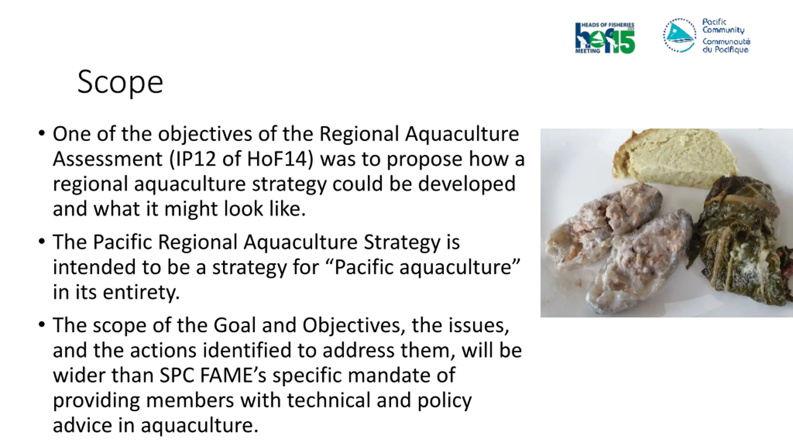 Scope One of the objectives of the Regional Aquaculture Assessment (IP12 of HoF14) was to propose how a regional aquaculture strategy could be developed and what it might look like. The Pacific Regional Aquaculture Strategy is intended to be a strategy for Pacific aquaculture in its entirety. The scope of the Goal and Objectives, the issues, and the actions identified to address them, will be wider than SPC FAME s specific mandate of providing members with technical and policy advice in aquaculture.