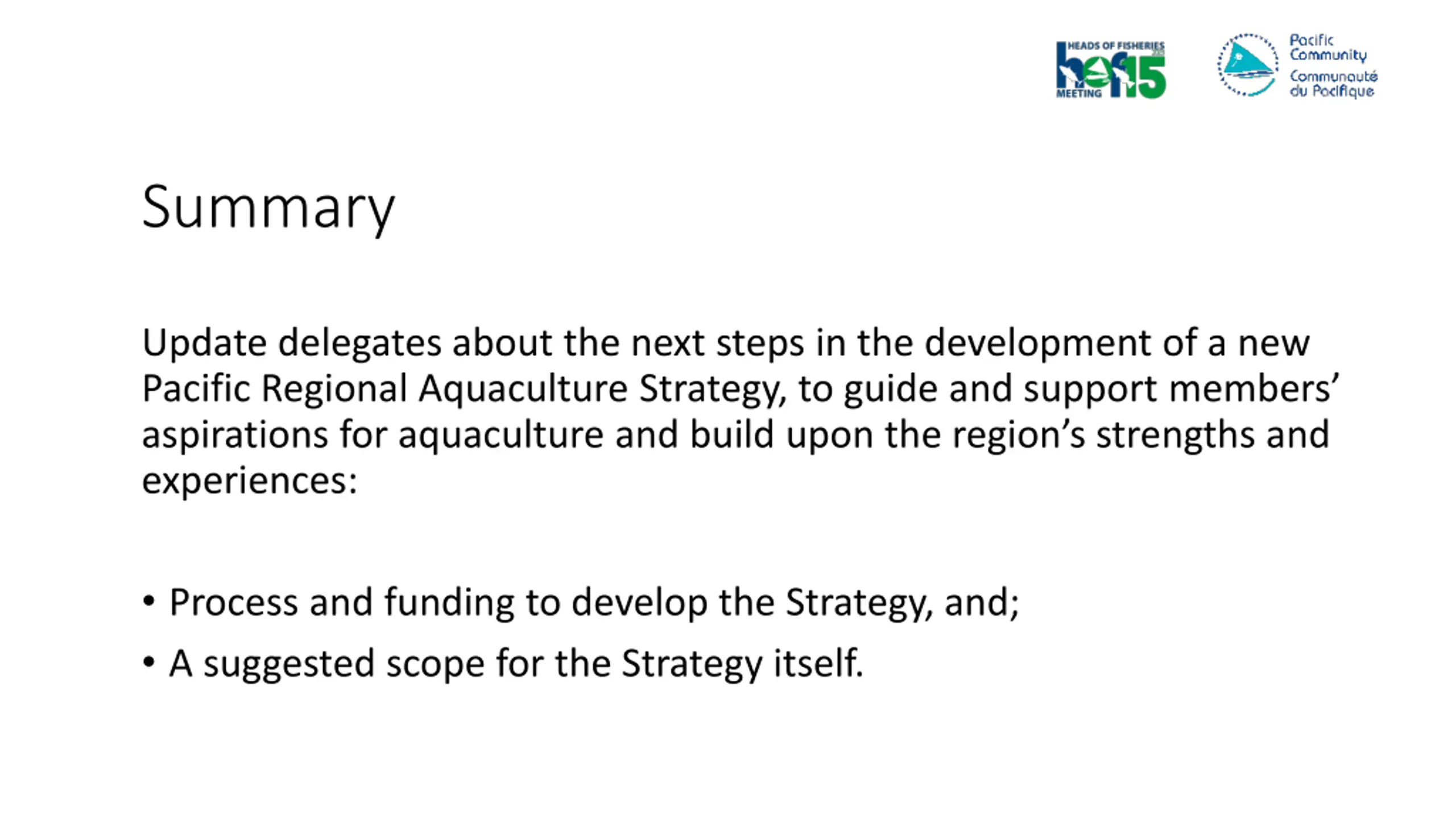 Summary Update delegates about the next steps in the development of a new Pacific Regional Aquaculture Strategy, to guide and support members aspirations for aquaculture and build upon the region s strengths and experiences: Process and funding to develop the Strategy, and; A suggested scope for the Strategy itself.